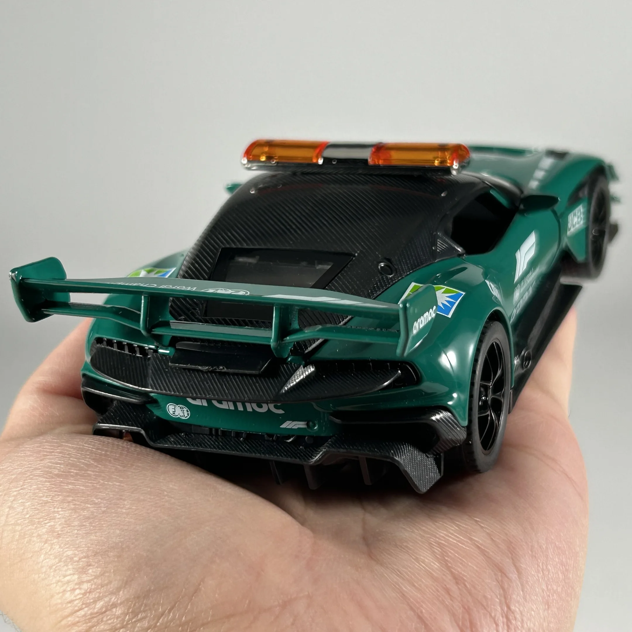 - Features include a vibrant green paint scheme with white sponsor logos, racing stripes, and a black roof, all meticulously applied to mirror a real high-performance race safety car.