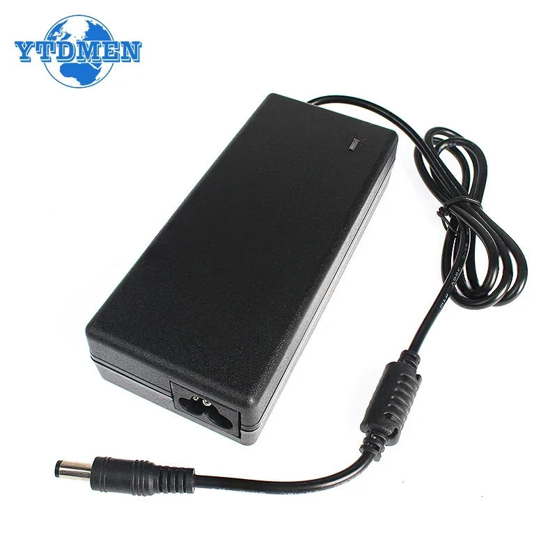 This high-quality 90W AC/DC power adapter features a compact, modern rectangular design with gently rounded edges and a smooth matte black surface, blending functionality with elegant aesthetics. Its minimalist style combines clean lines and streamlined contours, making it an unobtrusive addition to your workspace. The detailed label on top indicates essential specifications, safety certifications, and branding for easy identification and trust. The flexible, neatly coiled power cord extends from the side, secured by a twist tie, ensuring organized storage and safety. The output connector is a polished, silver cylindrical plug with a greenish ring around the tip, measuring 5.5mm x 2.5mm, providing reliable power transfer. The overall design exemplifies practicality and sophistication, offering durability and a refined appearance for everyday use.