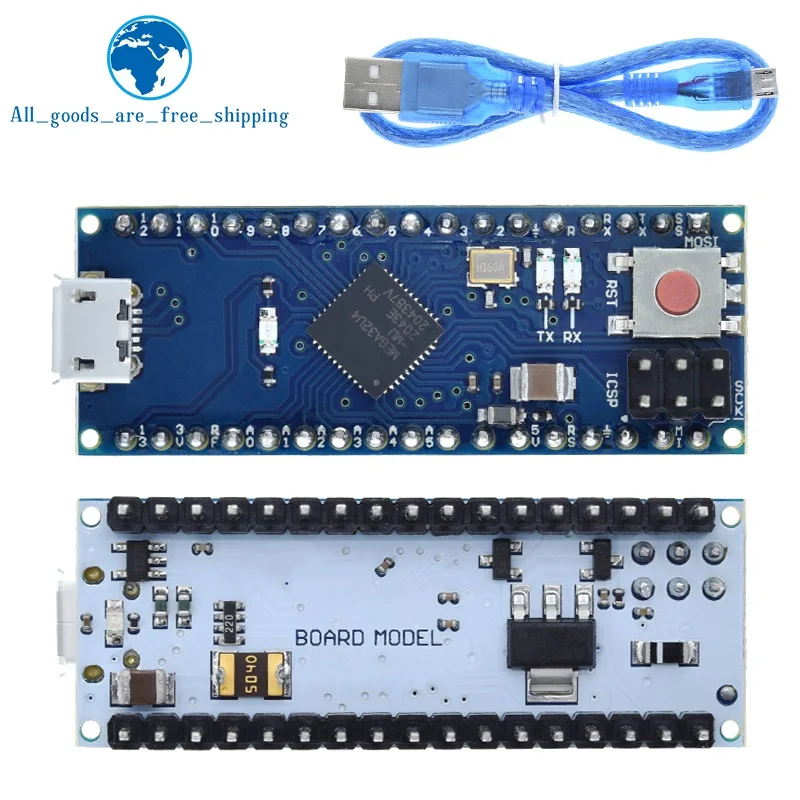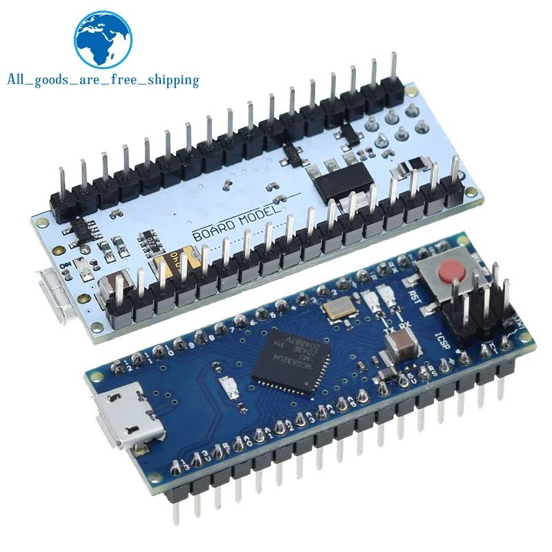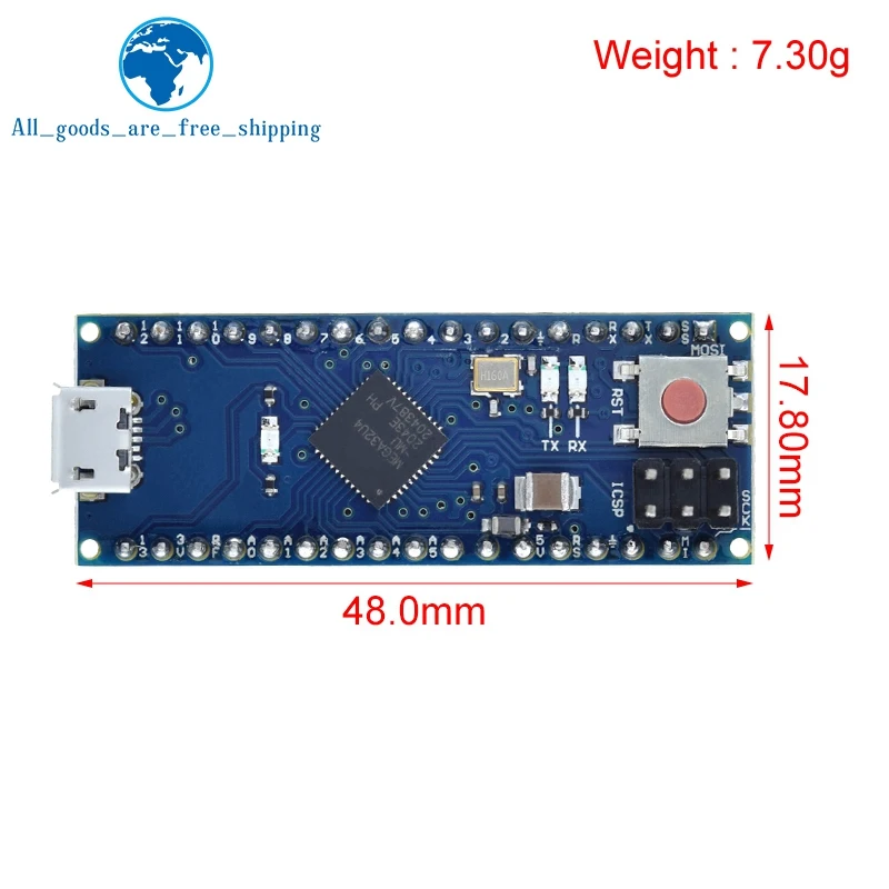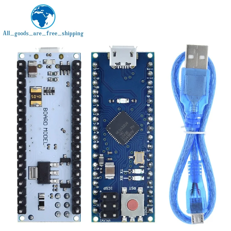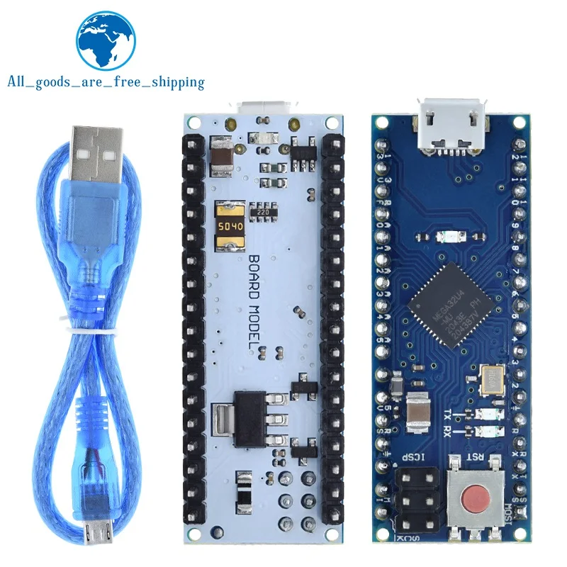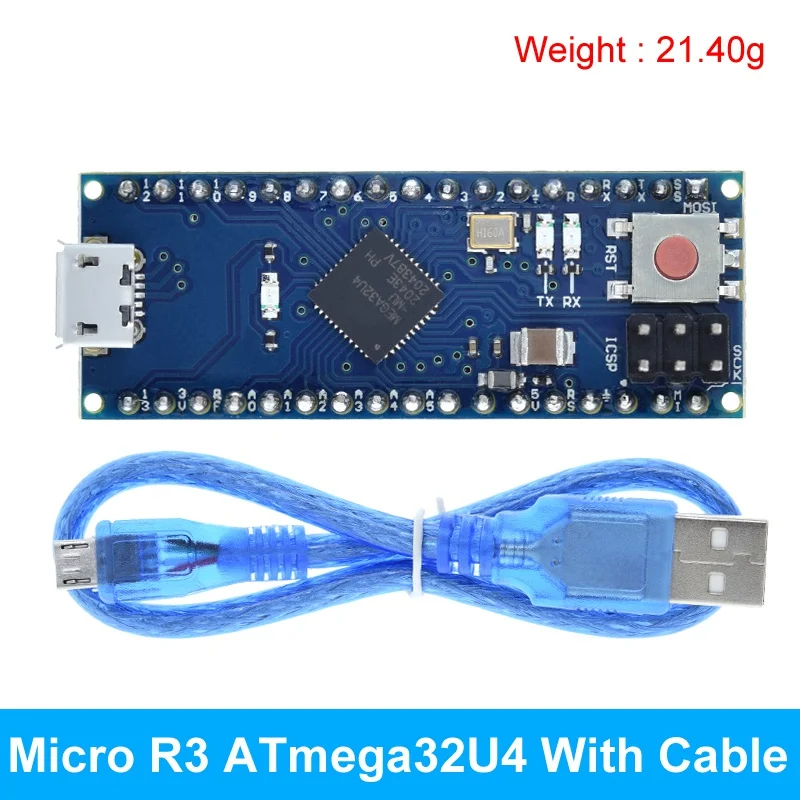 Experience precise control with this ATmega32u4-based microcontroller board, operating at 5V with a 16MHz clock speed. Designed for seamless USB communication and programming, the sleek blue PCB features a matte finish, densely populated with surface-mounted resistors and capacitors, complemented by a centrally located black integrated circuit chip with white markings. Small red and yellow components add subtle color accents, while shiny metallic pin headers and a white USB port enhance its professional, high-tech aesthetic. Available as a single or pack of three, this customizable module is ideal for microcontroller projects requiring reliable performance and elegant design.