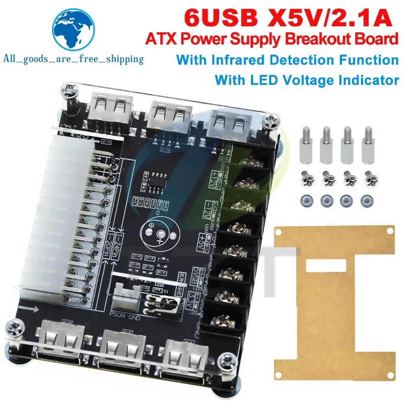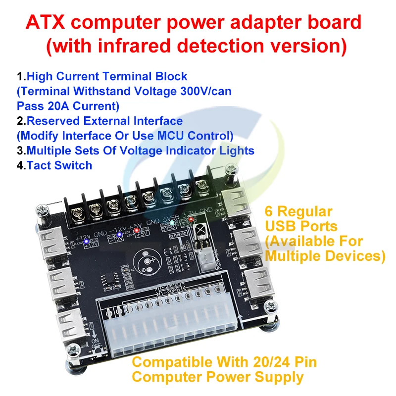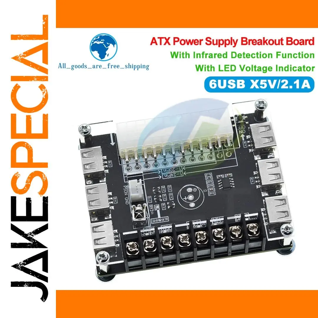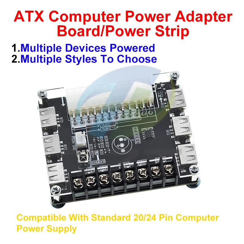 Experience the convenience and precision of this this ATX Power Supply Breakout Board with acrylic case kit. Designed with a sleek black circuit board, it offers a clean, organized layout that ensures easy connection and reliable power distribution. The transparent acrylic case showcases the internal components, highlighting a modern, minimalist aesthetic. Equipped with a 24-pin main connector, four USB ports, multiple screw terminal connections, and clear silkscreen labels, this module combines form and function seamlessly. Ideal for custom projects and electrical setups, it provides support for various voltage outputs including 3.3V, 5V, 12V, and a range from 1.8V to 10.8V. Whether you're a hobbyist or professional, this product adds a professional touch to your power management solutions.