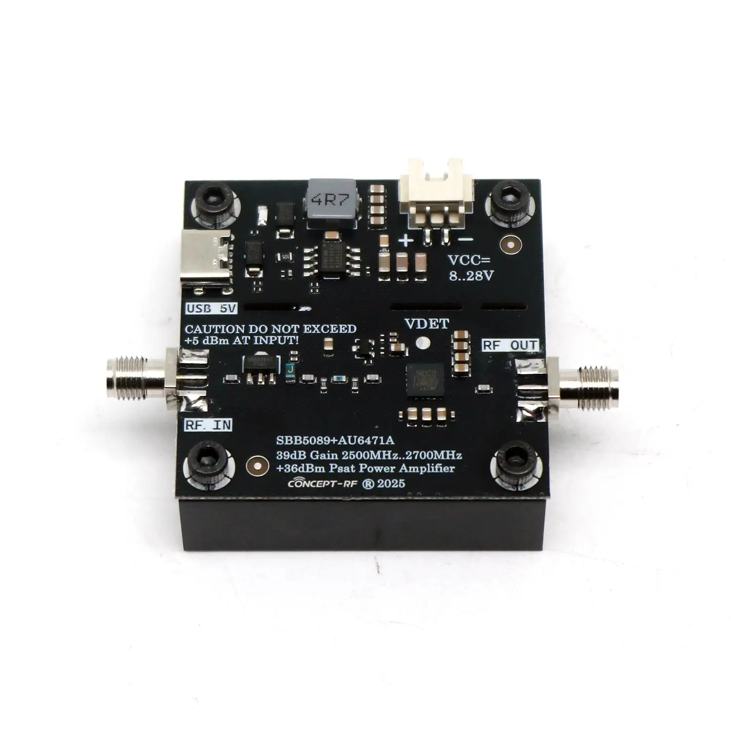 Experience reliable signal boosting with this this AU6471A 4W RF power amplifier, designed for seamless integration into your wireless projects. Its sleek, compact rectangular shape features a durable black matte finish, presenting a professional and modern look. The device measures approximately 50mm by 50mm with a height of 20mm, including surface-mounted components precisely arranged to optimize performance. The white Type-C USB 5V DC connector offers a minimalist contrast, emphasizing functionality, while the SMA RF connector provides secure input/output connections. An aluminum heatsink with fins ensures efficient heat dissipation, maintaining stable operation during extended use. Perfect for drone, Bluetooth, WiFi, Zigbee, and Lora applications, this amplifier combines technical excellence with a clean aesthetic, elevating your device’s performance in a compact form.
