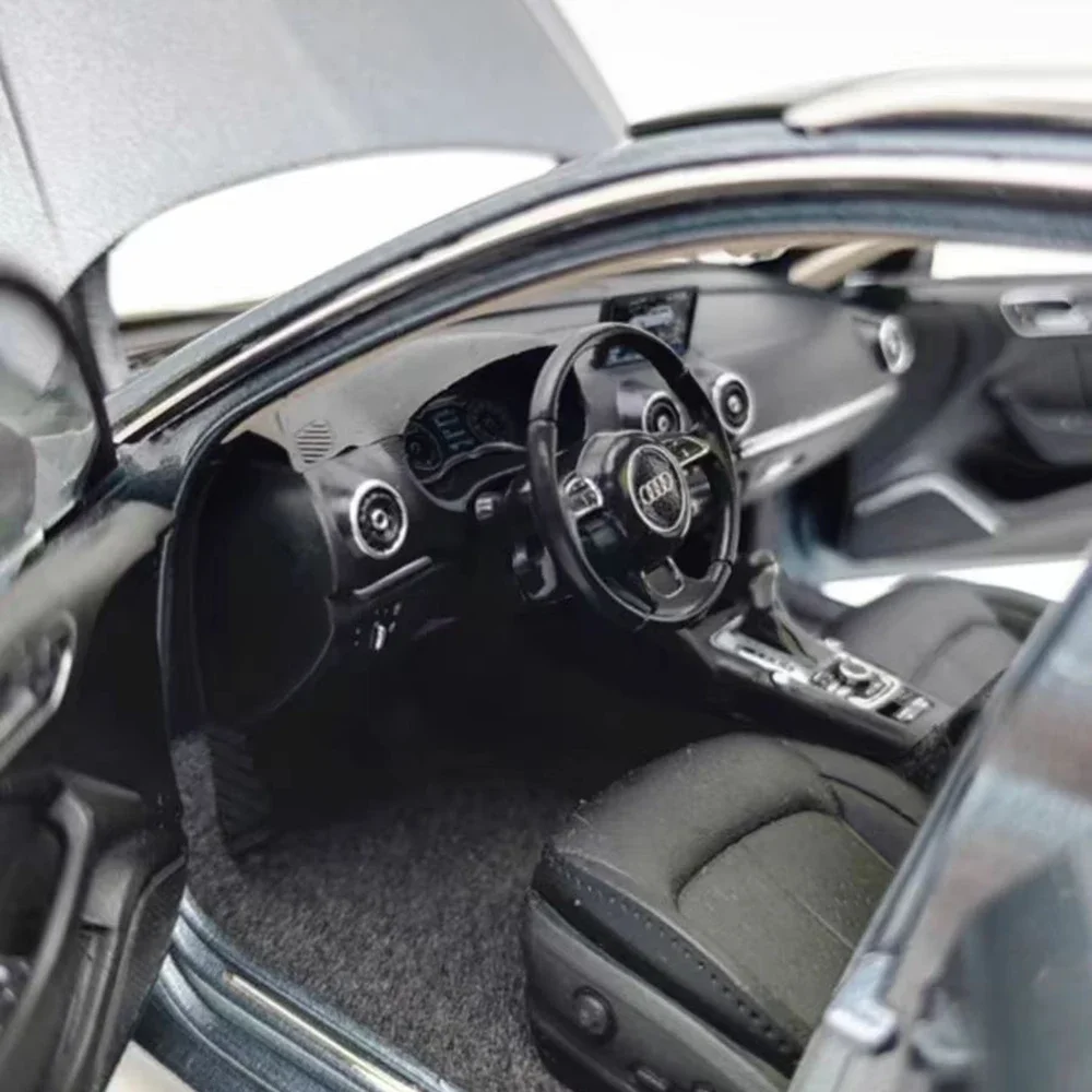 Step into a world of automotive elegance with this detailed 1:18 scale Audi A3 SUV model. Crafted with precision, its alloy body in a sophisticated metallic grey finish captures the sleek, sporty silhouette with smooth lines and a gently sloping roofline ending in an integrated spoiler. The sharp, angular headlights with intricate inner lighting details and the signature Audi grille highlight its modern design. Wide multi-spoked alloy-style rims with rubber tires add realism, complemented by shock-absorbing suspension. The model features a panoramic sunroof, opening doors, hood, and trunk, revealing a detailed interior with sliders, carpets, and realistic engine bay elements including a metal brake disc. It’s an exclusive collector’s piece that combines craftsmanship and style perfectly.