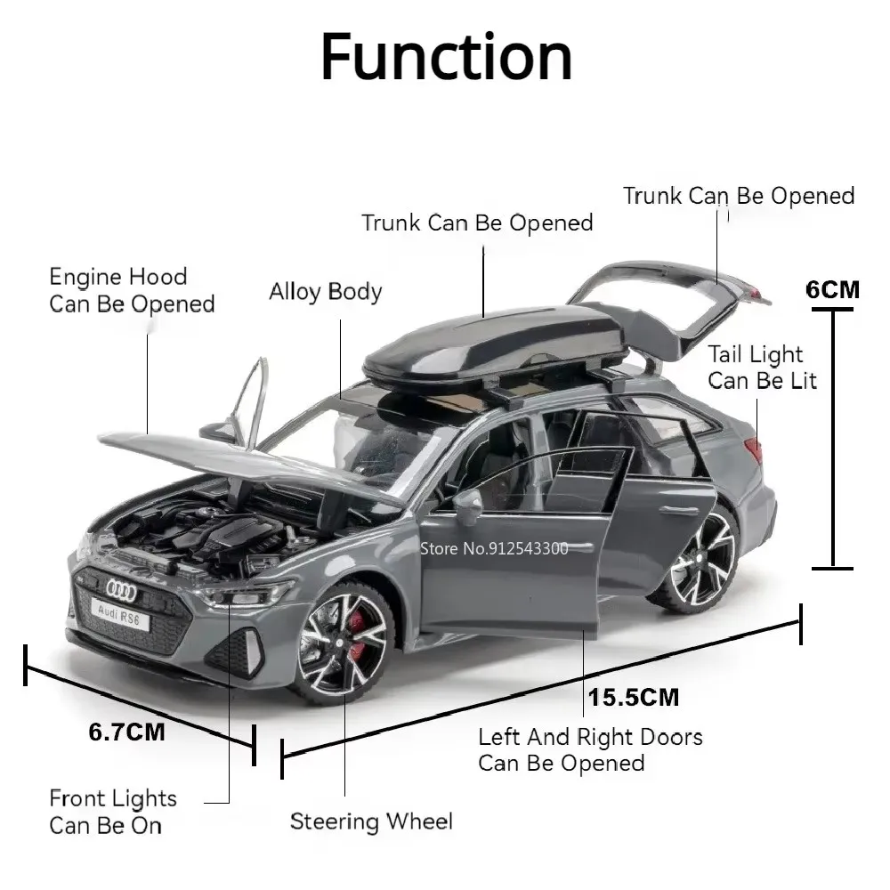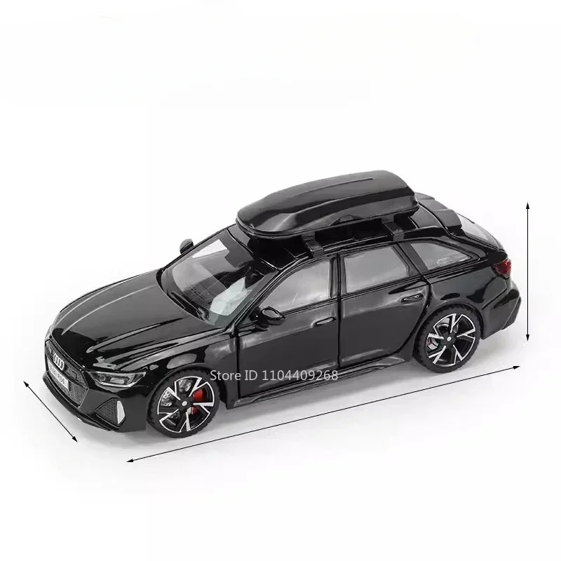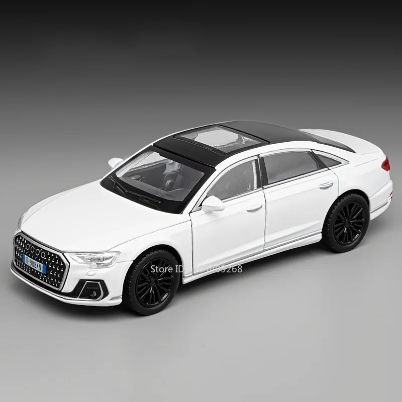 This 1:32 scale diecast car model showcases a sleek, high-simulation design with a metal body, plastic chassis, and rubber tires, measuring approximately 15.7 x 6.7 x 4.7 cm for the A8 version and 15.5 x 6.7 x 6 cm for the RS6. Available in black, white, and gray, it features realistic details such as a detailed grille, intricately designed headlights, and transparent windows, including a sunroof. Functional features include sound and light effects, pull-back propulsion, opening doors, and shock absorption, making it an impressive collectible or gift for adult enthusiasts seeking a highly detailed miniature vehicle.