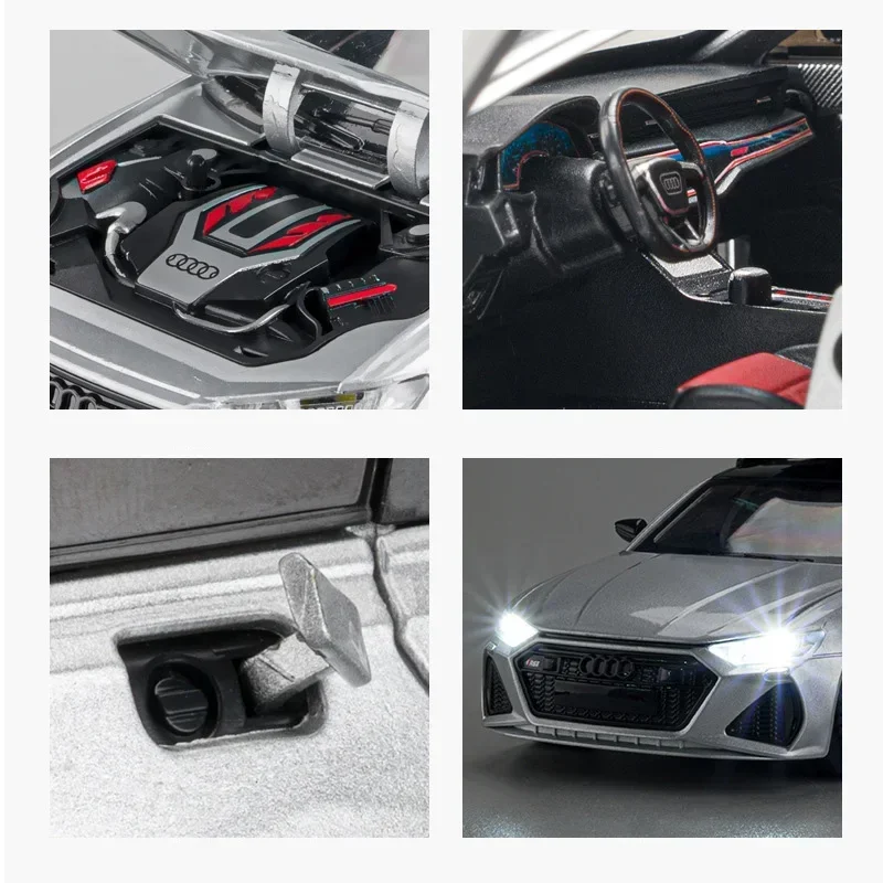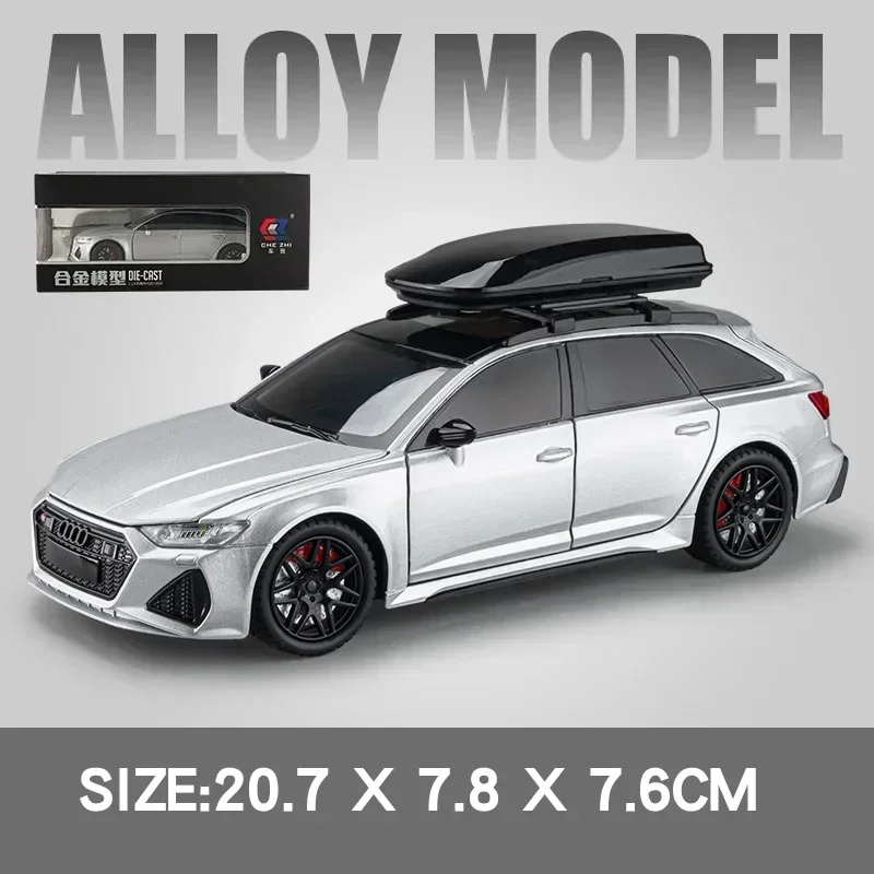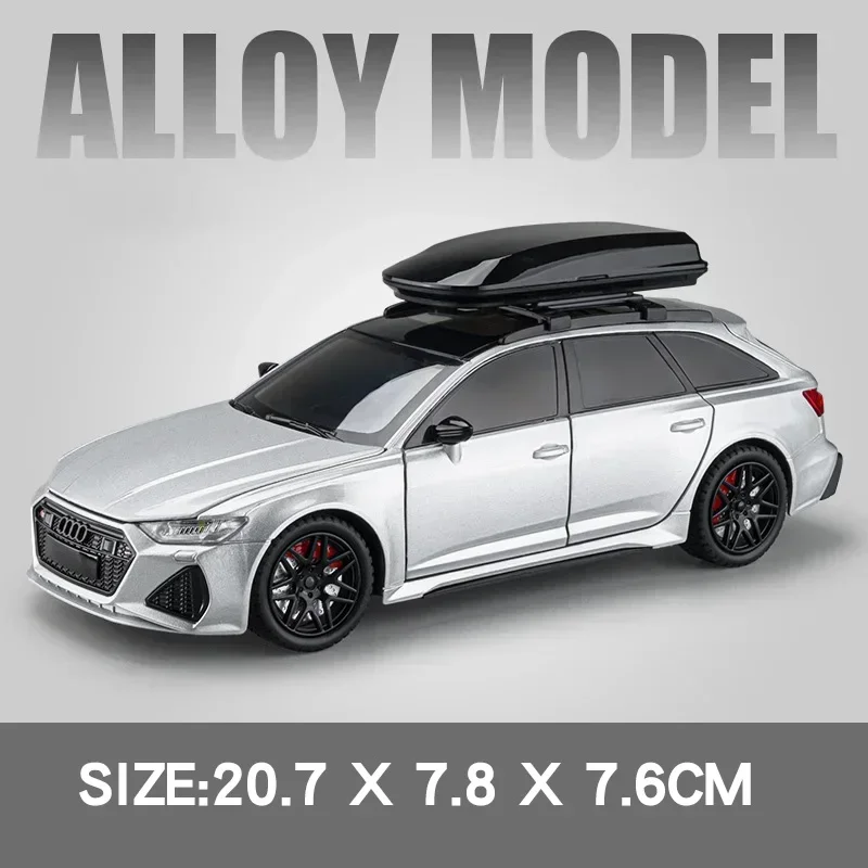 The 1:24 scale Audi RS6 Travel Edition die-cast model showcases a sleek silver exterior with a polished finish, characterized by sharp lines and an aerodynamic silhouette. It features a detailed front grill with the Audi logo and intricately designed headlights for a realistic appearance. The model boasts sporty black alloy wheels with visible red brake calipers, enhancing its visual appeal. A prominent black roof box adds to the travel theme, while tinted windows made from clear plastic complete the sleek look. Equipped with sound and light functionality powered by a button battery, this model is constructed from durable metal for collectors.