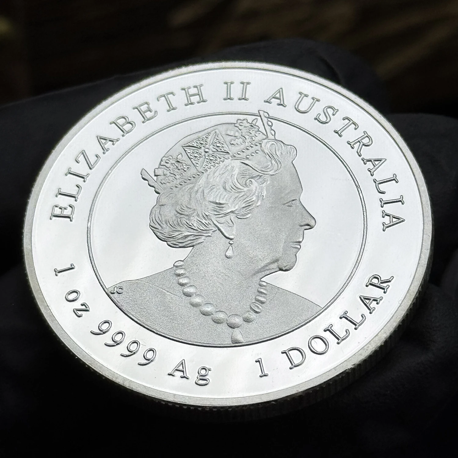 Imagine enhancing your collection with this exquisite 2015 Australian Koala replica medal. Measuring approximately 40mm in diameter, this piece features intricately carved details that bring the vibrant-looking koala to life, set against a textured background resembling tree bark or lush foliage. The realistic depiction includes soft gray fur with subtle tonal variations and pink accents inside the ears, capturing the charm of Australia’s native wildlife. On the reverse, a finely engraved portrait of Queen Elizabeth II showcases her regal elegance with a detailed crown, earrings, and necklace. The overall vintage silver-colored finish emphasizes craftsmanship and quality, making this medal an eye-catching addition to any display, inspiring pride and nostalgia.