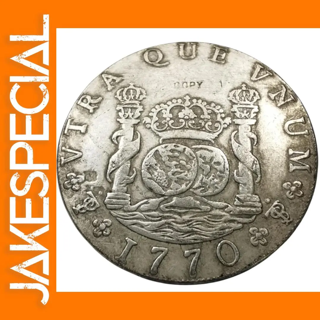 Imagine owning a beautifully crafted Bolivia 8 Reales replica, reminiscent of the 1769-1770 coin. Its circular form showcases a detailed, ornate surface with a shiny, reflective finish that mimics the aged patina of historical coins. The central feature includes a prominent, crowned coat of arms, divided into sections with heraldic symbols, surrounded by intricate engravings. Flanking columns topped with crowns and floral motifs enhance its regal appearance. The finely inscribed border adds an authentic touch, making this piece a striking display item. Whether you're a collector or simply appreciate historical artifacts, this replica perfectly combines craftsmanship and aesthetic appeal, allowing you to enjoy a tangible connection to the past. Its durable yet lightweight build makes it ideal for display, casual handling, or as a conversation starter in any collection.