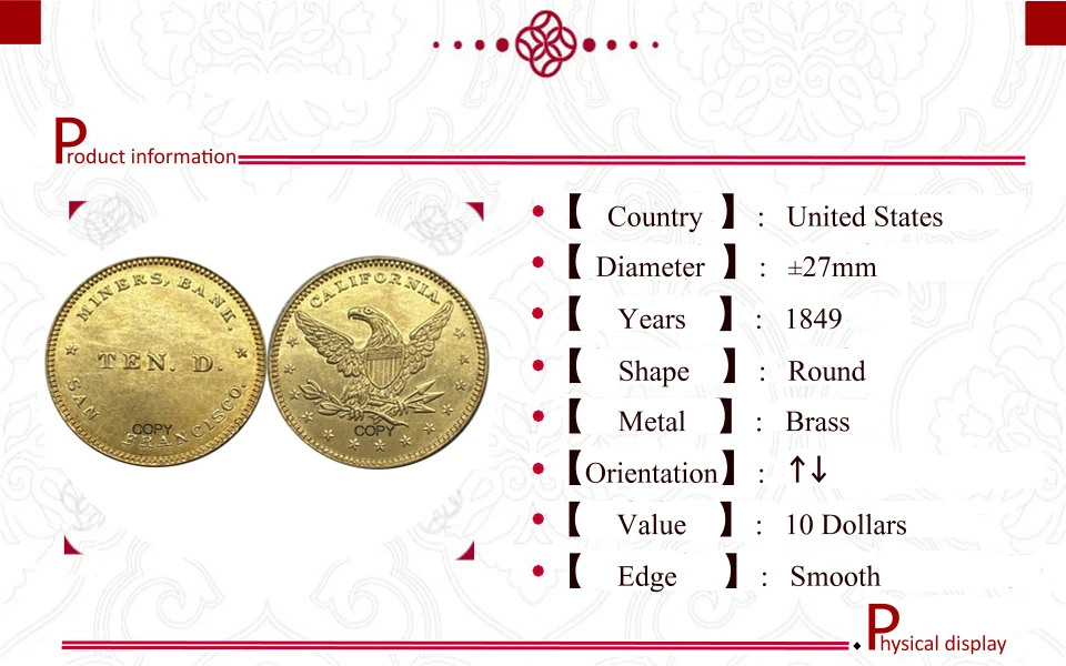 Bring a piece of California’s historic gold rush era into your collection or display today. This meticulously crafted replica combines artistic craftsmanship with period authenticity, making it a striking addition to any collection or decor. Its vintage style and detailed design allow you to appreciate history while enjoying a unique decorative item. Perfect for history buffs, collectors, or as a thoughtful gift, this coin invites you to experience the allure of the 19th-century gold rush. Elevate your collection with this timeless piece—order now and celebrate an important chapter in American history.
