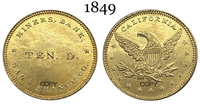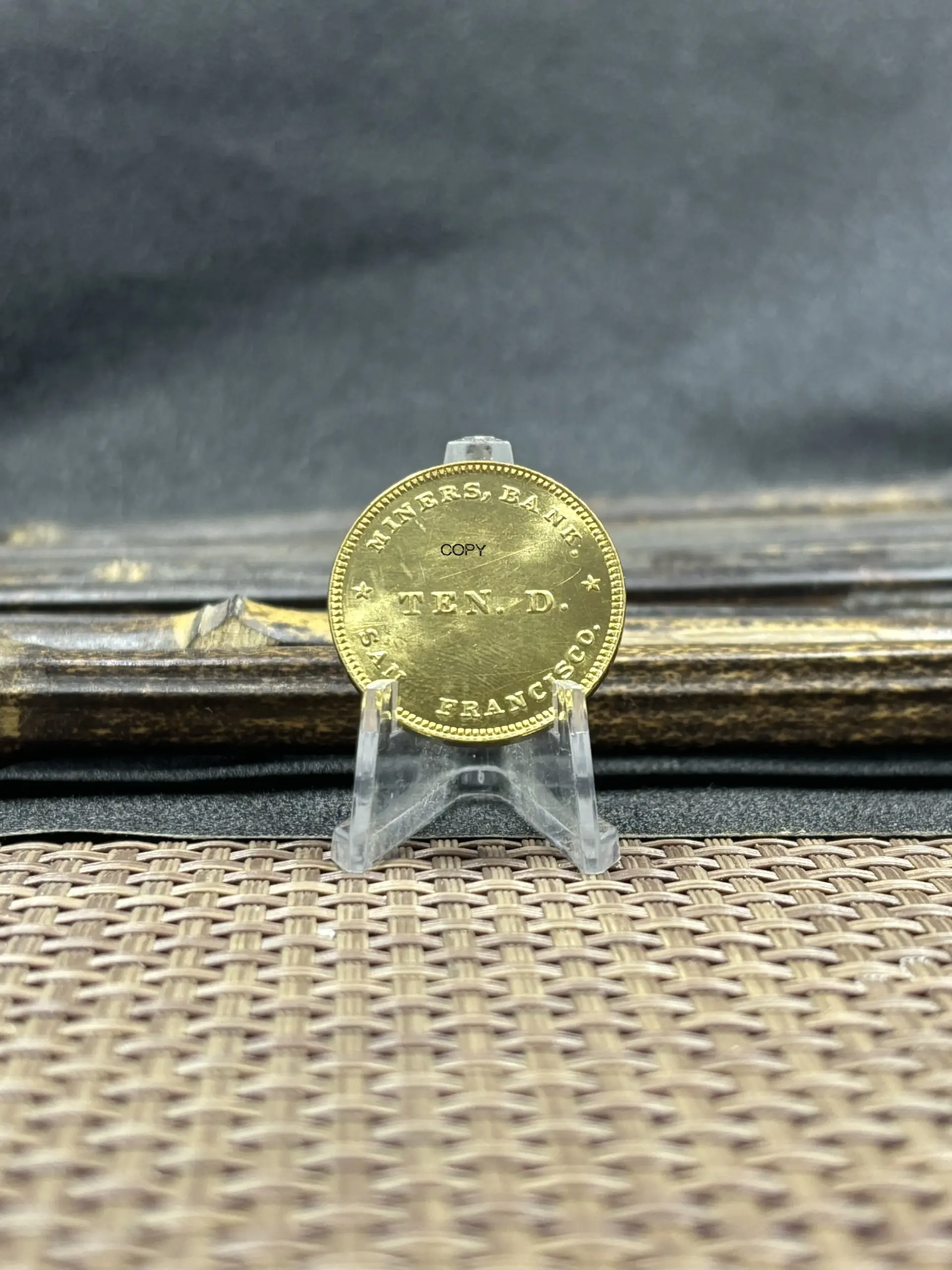 Step back into history with this beautifully crafted replica California Gold Rush coin. Designed to evoke the spirit of the 1840s-1850s, this coin features a textured, aged surface and an antique European style that exudes vintage charm. Its rich golden hue is complemented by a matte, distressed finish for an authentic worn look. The detailed beaded border enhances its elegance, while the bold, raised “TEN. D.” inscription at the center highlights its denomination. Delicate decorative elements, including tiny flowers or stars, separate the inscriptions “MINERS, BANK,” and “SAN FRANCISCO” along the upper curve. Perfectly suited for collectors, history enthusiasts, or as a decorative piece, this item offers exceptional craftsmanship and timeless appeal.