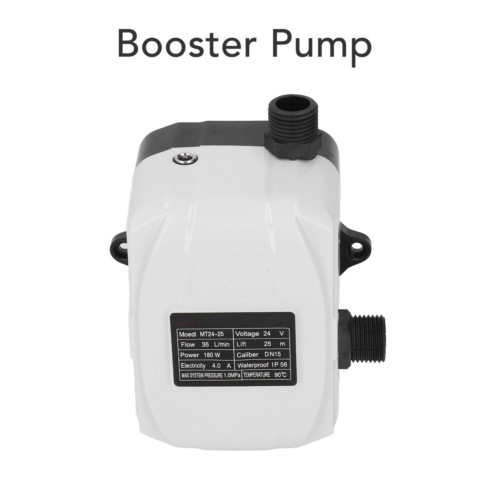 This compact, white automatic booster pump features a durable brass core motor and supports EU power supply (AC 100-240V). Operating at 24V DC with 180W power and 4.0A current, it delivers a flow rate of 35 liters per minute and a maximum lift of approximately 25 meters (82 feet). Its design includes a black top and side inlet/outlet, with an IP56 protection class, ensuring reliable performance in various environments. Equipped with intelligent start-stop, low-pressure protection, and automatic water flow induction, it is ideal for household water pressure boosting in faucets, showers, water heaters, and irrigation systems. Easy to install and operate quietly, it’s the perfect addition for improving water efficiency.