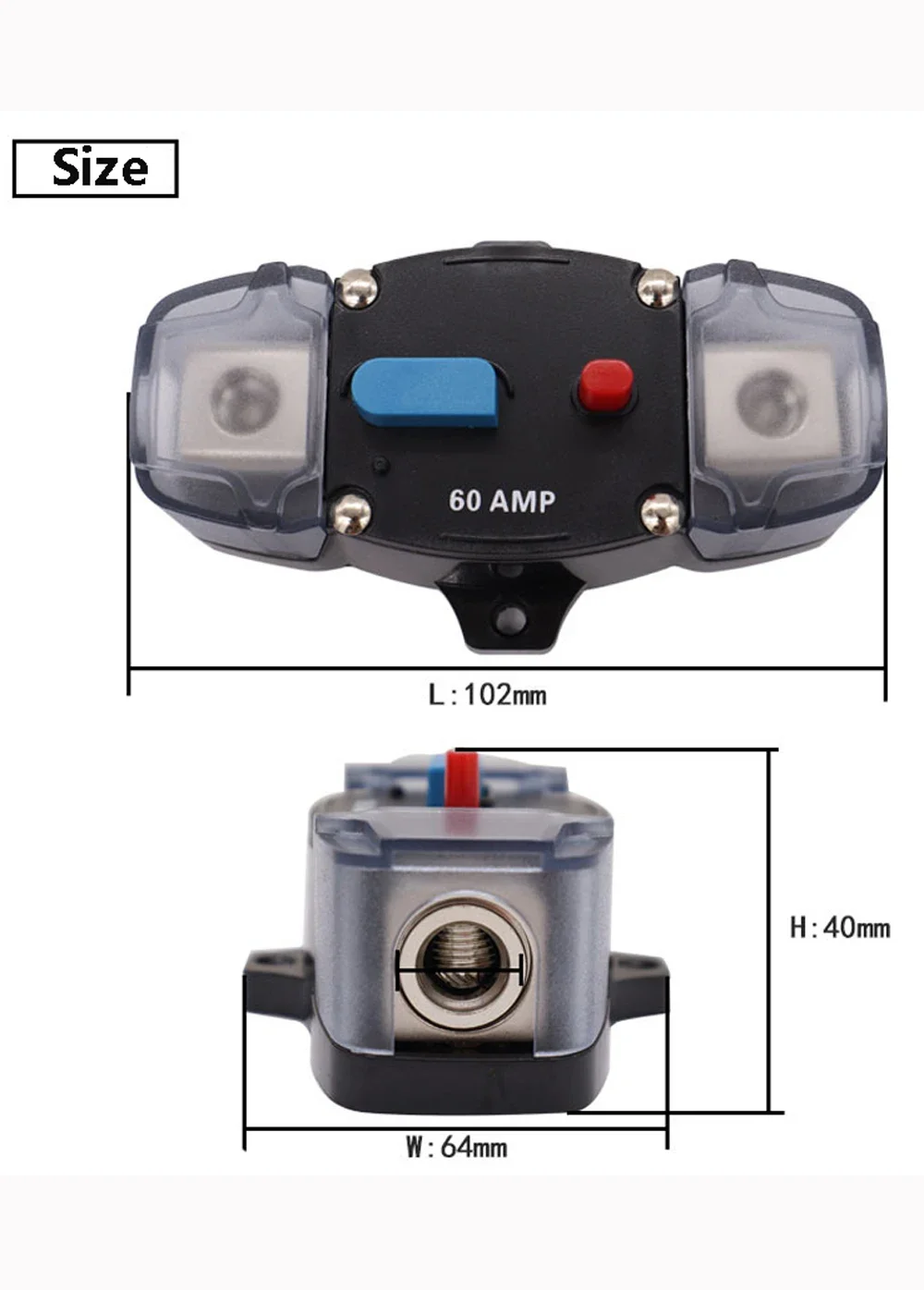 Experience reliable power protection with this auto reset circuit breaker, designed specifically for automotive, RV, and boat stereo systems. With a durable black rubberized body, it offers a sleek, industrial look that ensures durability in harsh conditions. Measuring 102mm in length, 64mm in width, and 40mm in height, it features a prominent blue push button for manual reset, which doubles as a kill switch for added convenience. The small red indicator provides visual status updates, enhancing safety. With high-conductivity terminals and translucent covers to protect against dirt and moisture, this device is built for outdoor and demanding environments. It effectively prevents power surges, power overcurrent, and voltage spikes, ensuring your sensitive electronics stay safe during operation.