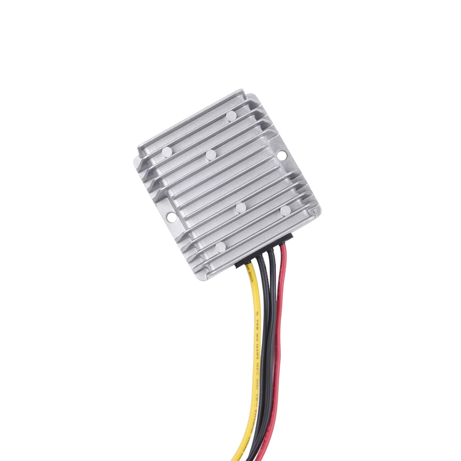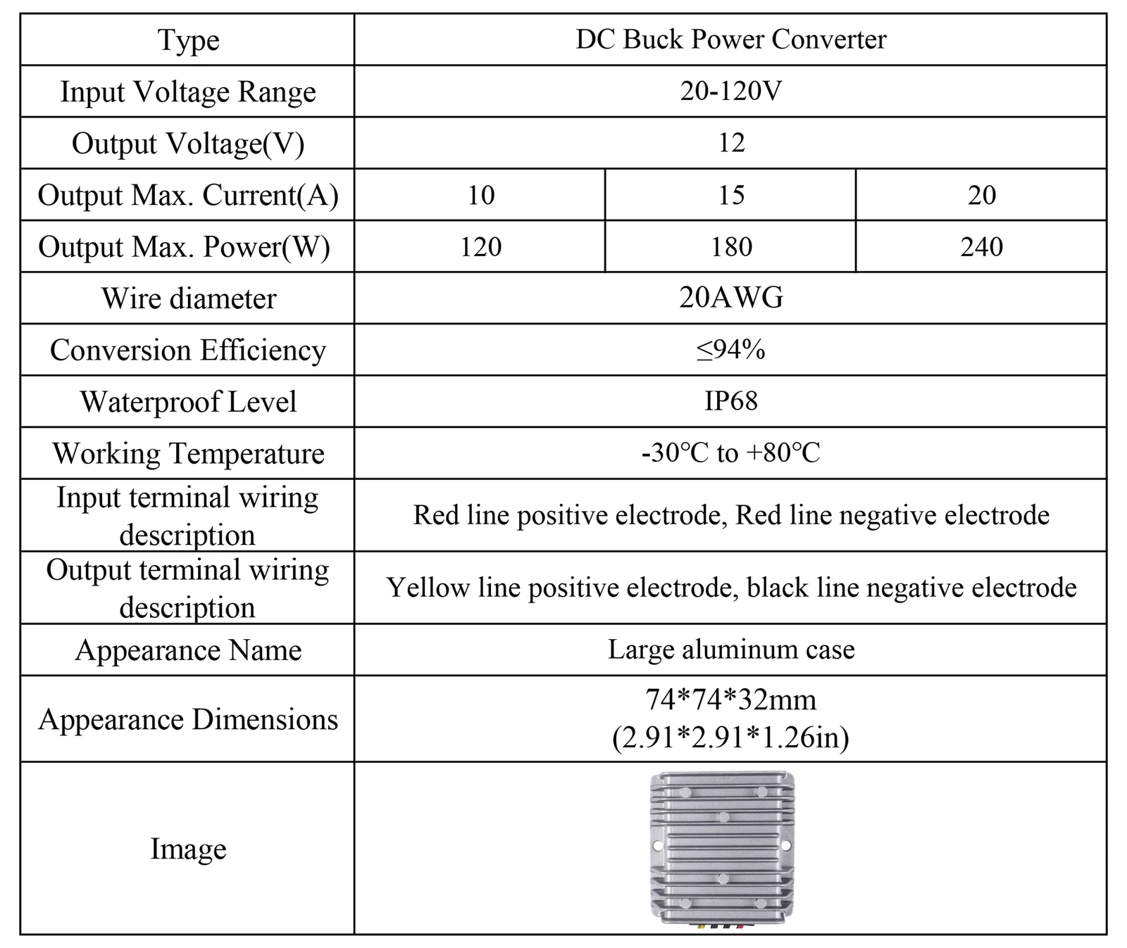 Experience reliable power conversion with this high-efficiency DC power converter, designed for automotive applications. It features an input voltage range of 20-120V DC and a fixed output of 12V DC, with adjustable current options of 10A, 15A, or 20A to suit your needs. Encased in a durable die-cast aluminum shell and epoxy resin potting, it offers excellent heat dissipation through natural air convection and a service life of up to 100,000 hours. The converter includes protections against low voltage, overload, and over-temperature conditions, ensuring safe and consistent performance. Available in different aluminum shell colors, it combines robustness with a sleek, industrial aesthetic.
