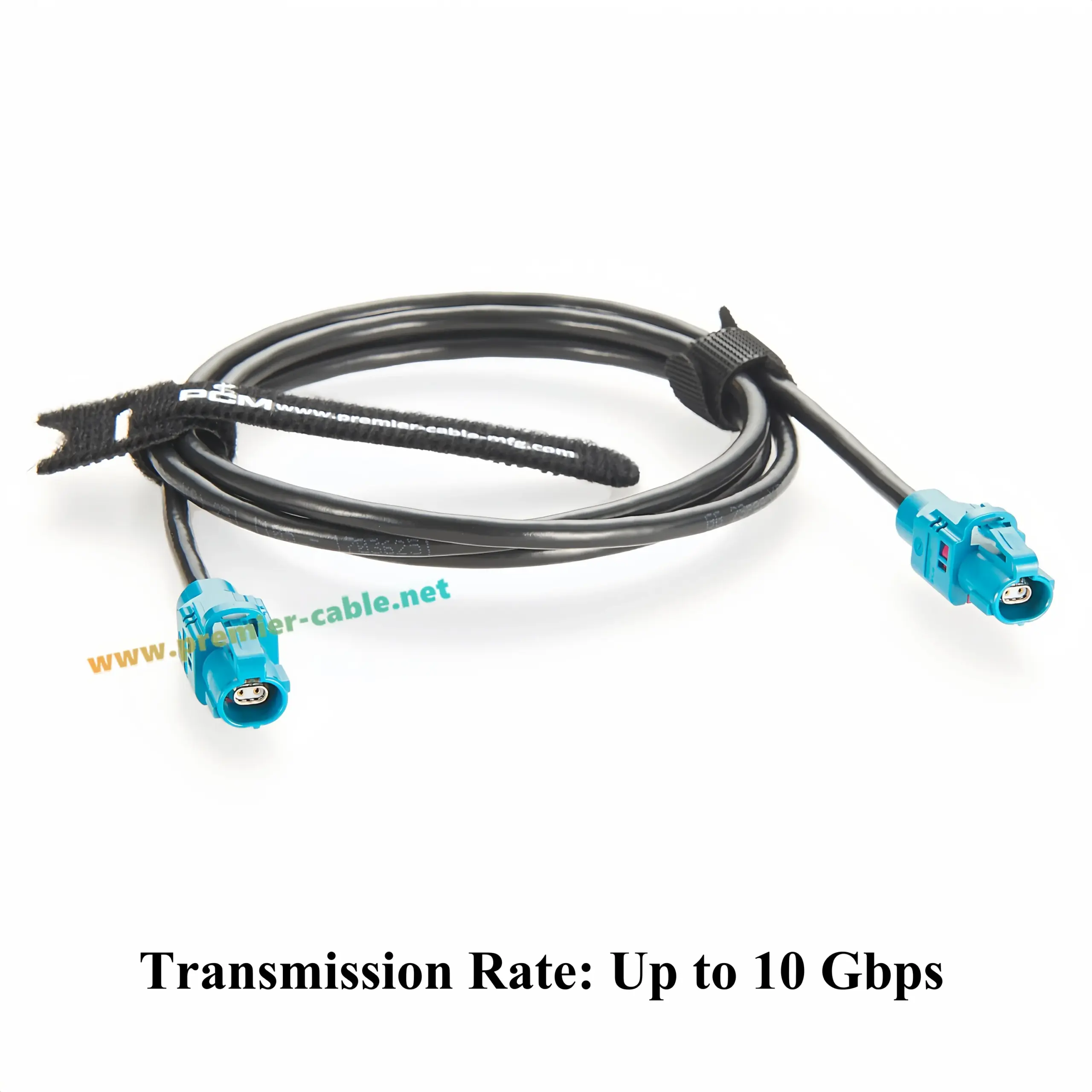 Experience seamless high-speed data transfer with this high-quality automotive Ethernet cable from PremierCable. Crafted with durability and precision engineering in mind, this cable features Rosenberger original H-MTD Z coding female connectors on each end, ensuring a secure, reliable connection. Its sleek matte black outer jacket is made from high-grade material, providing excellent resistance to harsh environments. The connectors are light blue, embodying a modern, professional look with smooth surfaces and reinforced locking mechanisms. Whether for infotainment, telematics, or autonomous driving systems, this cable supports up to 10 Gbps transmission rates over a robust 100 ohm impedance. It’s designed to perform flawlessly at temperatures between -40°C and +105°C, making it ideal for demanding automotive applications.