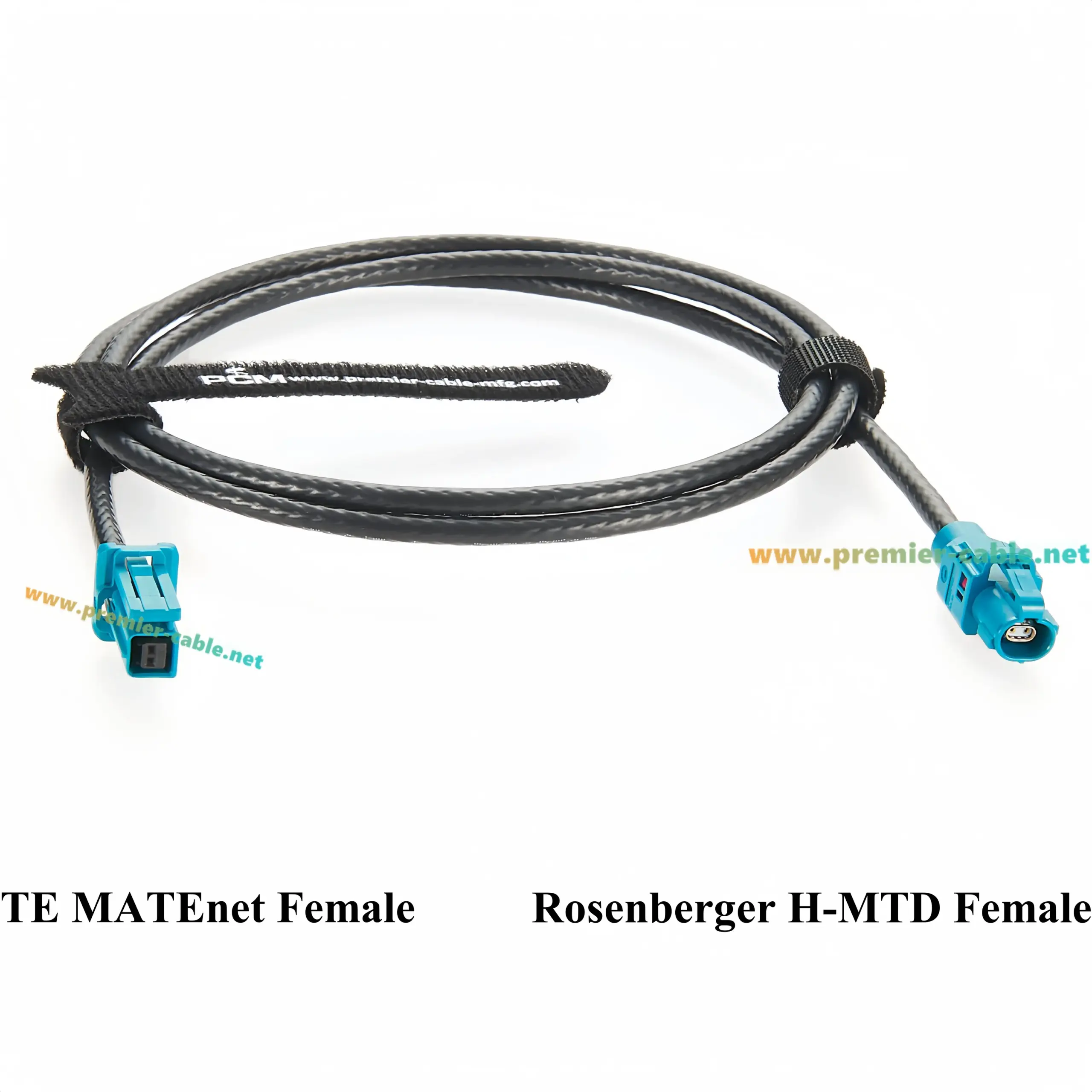 - Connectors include a female Rosenberger H-MTD (E6K10A-1BZZ5-Z) with a rectangular blue housing and a black locking mechanism, ensuring secure connections.