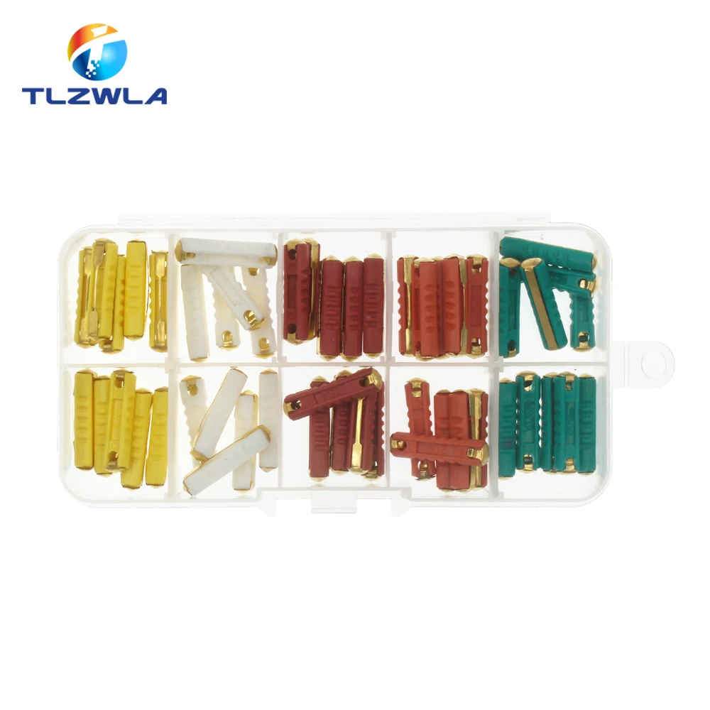 Experience reliable automotive protection with this comprehensive set of 50 color-coded fuses. Designed for vintage and modern vehicles, each fuse features a 6mm diameter copper blade, ensuring durable conductivity. The vivid colors instantly identify amperage ratings: light blue for 5A, white for 8A, green for 10A, red for 16A, blue for 25A, and yellow for 30A, simplifying installation and replacement. With a voltage capacity of 32V and adherence to IEC safety standards, these fuses provide low breaking capacity protection, minimizing damage during overloads. The transparent plastic storage box with secure snap-on lid and blue latch ensures effortless organization and quick access. Ideal for automotive electrical systems, this set offers high-quality, customizable, and RoHS-certified components to meet your maintenance needs with confidence.