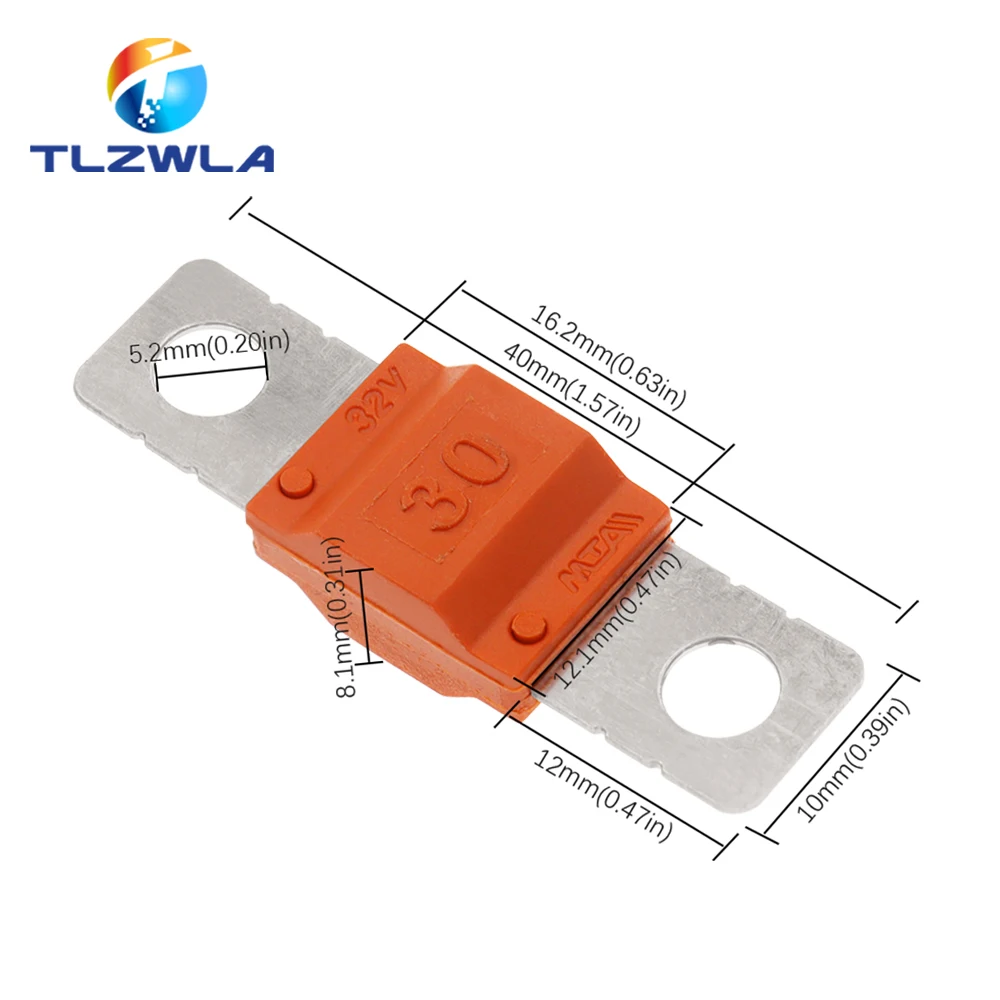 This automotive ANL stud fuse features a durable copper construction and is available in amperages from 20A to 200A, including 30A, 40A, 50A, 60A, 70A, 80A, 100A, 125A, 150A, 175A, and 200A. Designed for automotive applications, its sleek rectangular shape is highlighted by a vibrant variety of colors—white, brown, yellow, red, green, purple, black, pink, and blue-orange—each indicating a specific amperage rating. The fuse has shiny metallic tabs with circular holes for secure mounting and connectivity, embossed numerical ratings for easy identification, and features a low breaking capacity for safety. Pack options include 1 or 5 pieces, making it a reliable choice for custom automotive electrical systems.