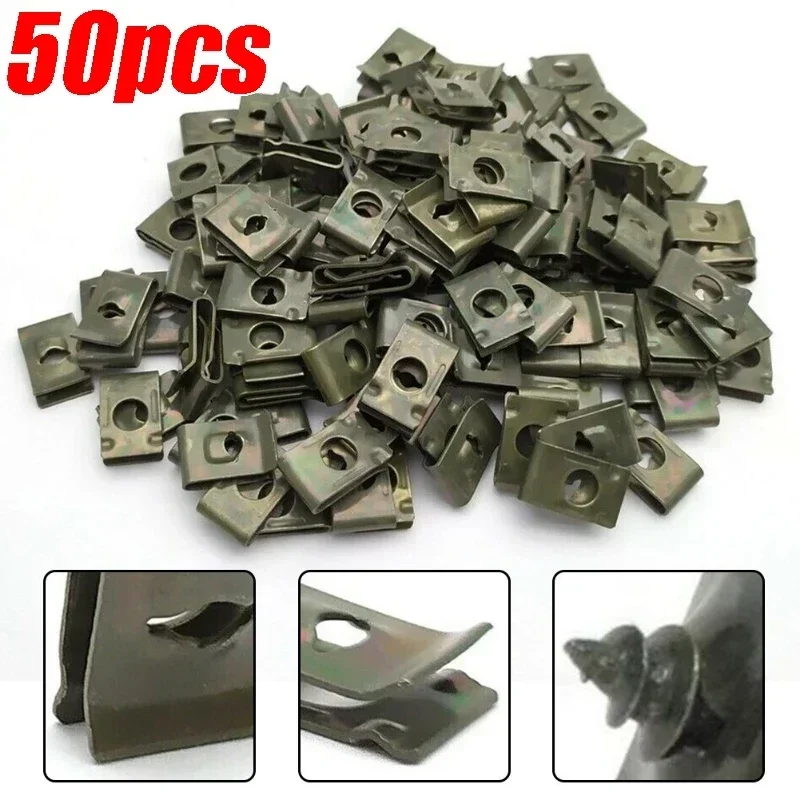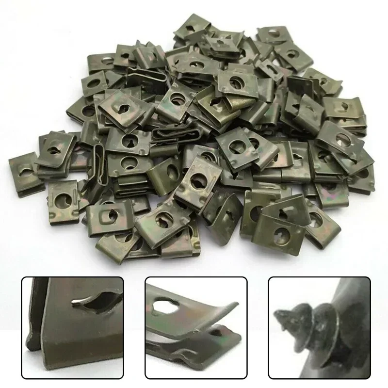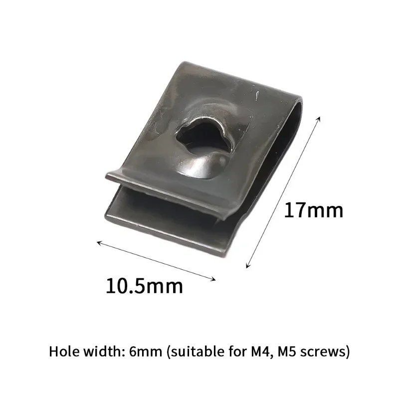 Imagine having a reliable supply of metal clips ready for your automotive or motorcycle maintenance. These high-quality, iron fastener clips feature anti-rust protection, ensuring they withstand outdoor conditions. Each sturdy clip measures approximately 10.5 centimeters in length, 17 millimeters in width, and has a 6mm hole compatible with M4 and M5 screws. Their sleek, minimalistic design emphasizes strength and functionality, perfect for securing panels, cables, or sheets in cars, trucks, and motorcycles. Whether you need a bulk set of 50 or 100, these clips guarantee a durable and professional finish for your repair or assembly projects. Effortlessly replace old or missing clips and confidently handle your vehicle maintenance with this versatile set.