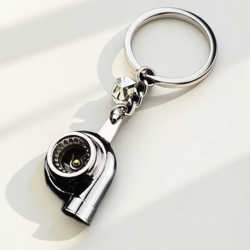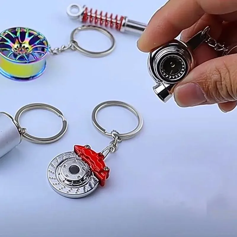 - The set includes six car-inspired metal keychains: shock absorber, brake rotor, gearbox, rim, turbo, and helmet, each measuring between 8.5cm and 10.4cm with detailed models.