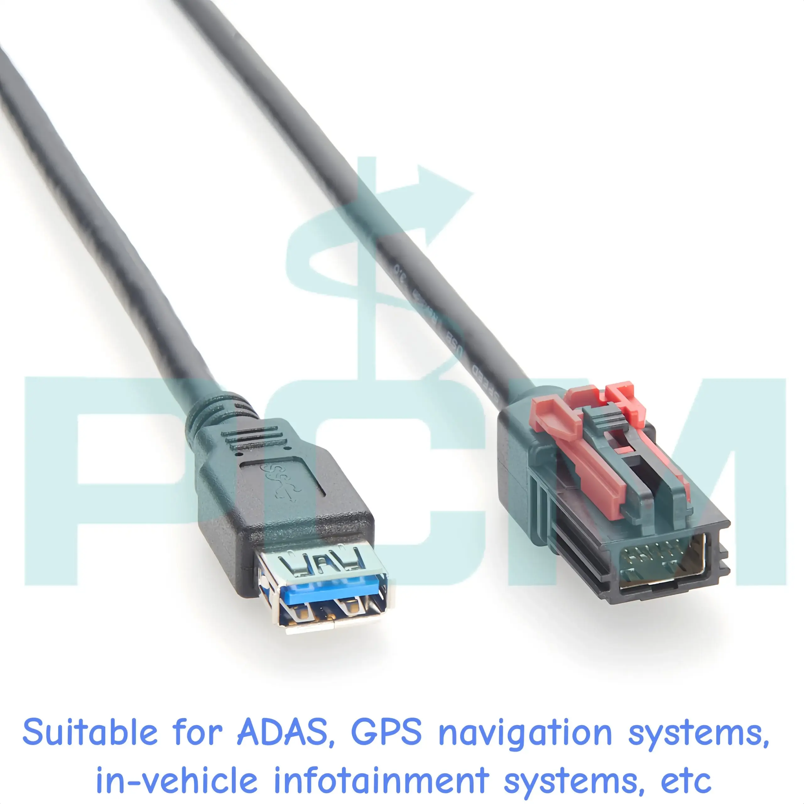 Experience seamless data transfer with this high-speed automotive cable designed for your vehicle's electronic systems. Measuring one meter, it features a durable black outer jacket with a sleek, modern finish. One end has a USB 3.0 Type A female connector highlighted by its vibrant blue interior, signifying fast data transmission up to 5Gbps. The housing is slightly textured with an embossed USB symbol for added durability. The other end showcases a sturdy black 12-pin HSAutoLink male connector, compatible with Molex 111146-3080, featuring a red latch mechanism for secure attachment. This design ensures reliable connections in demanding automotive environments, making it ideal for infotainment, telematics, navigation, ADAS, and ECU flashing systems. Created for professionals and enthusiasts, this cable provides the confidence to manage vehicle data with ease and precision.