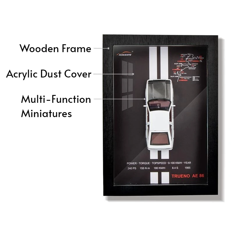- This 12-inch display features a modern wooden frame paired with a detailed 1:32 scale diecast metal model, available in vibrant color options like AE86, BMW M8 GTE, and Chevrolet Camaro for customization.