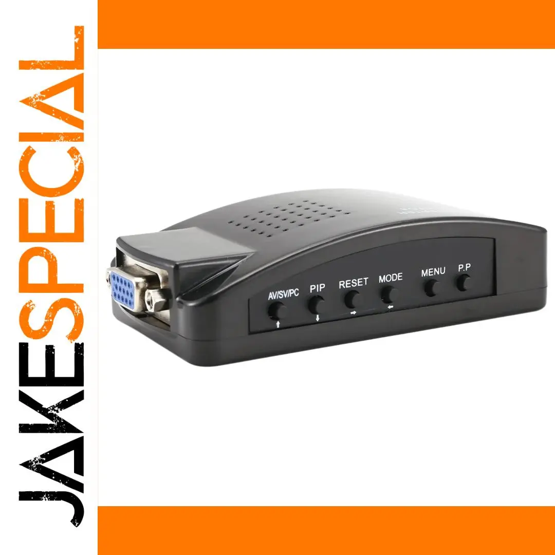 Experience seamless multimedia connectivity with this versatile AV to VGA converter. Designed in a sleek black plastic enclosure with a modern rectangular shape and gently rounded edges, it offers an ergonomic and professional aesthetic. The top surface is subtly curved and features small ventilation holes arranged in a grid pattern for efficient cooling. With easy-to-use push buttons labeled for input source switching, mode adjustment, PIP, and menu access, this device provides intuitive control. Its compact design allows straightforward plug-and-play installation, making setup quick and hassle-free. Whether you are connecting DVD players, CCTV cameras, or game consoles to a VGA monitor or LCD TV, this adapter ensures a crisp, high-quality output supporting resolutions up to 1920×1200@60/75Hz. It's ideal for professional and home multimedia applications.