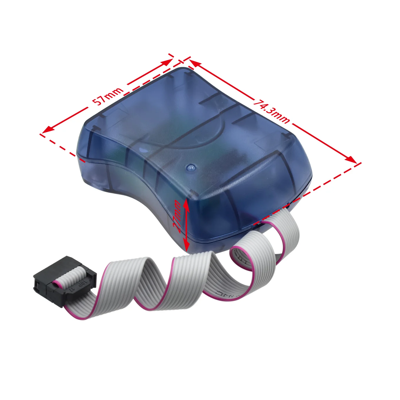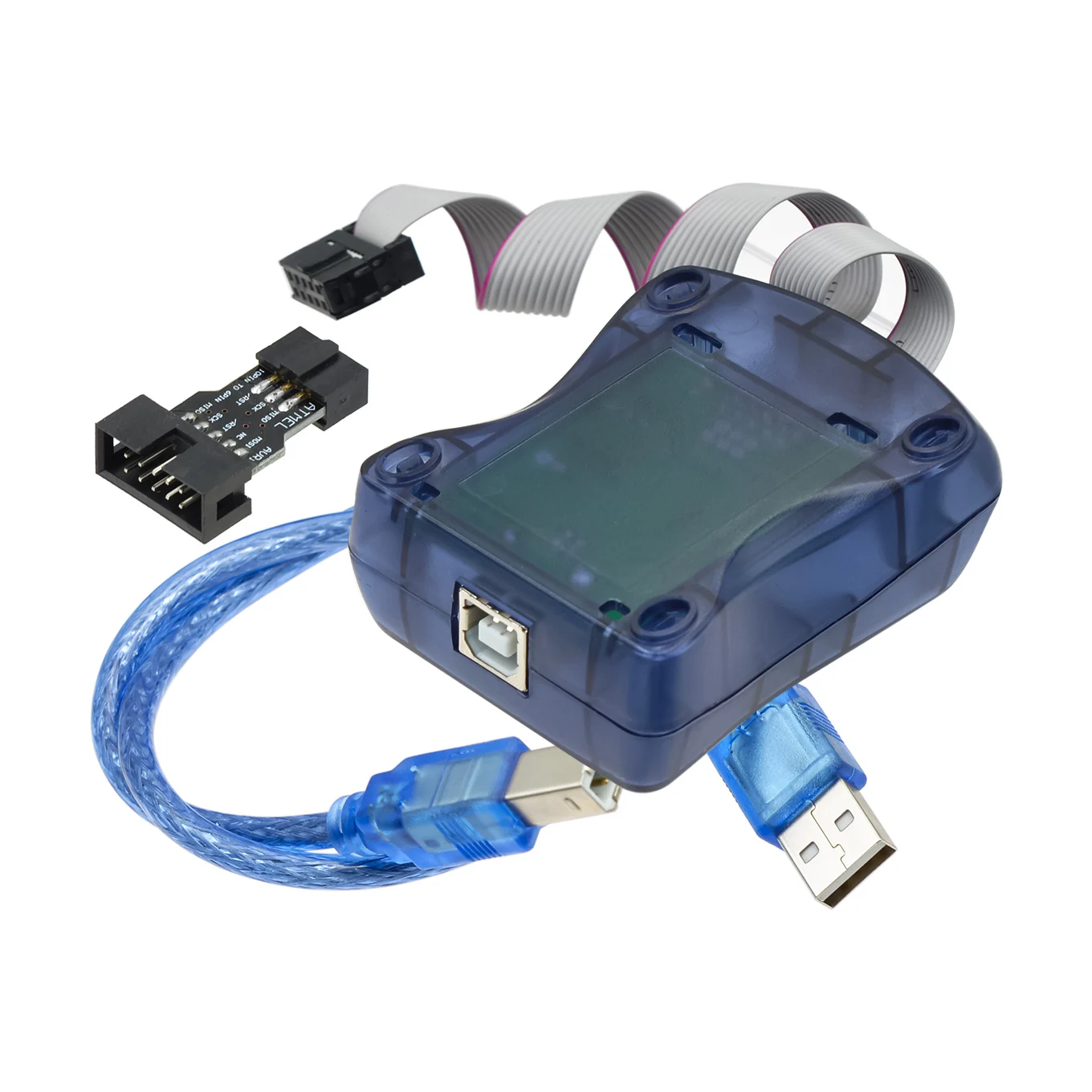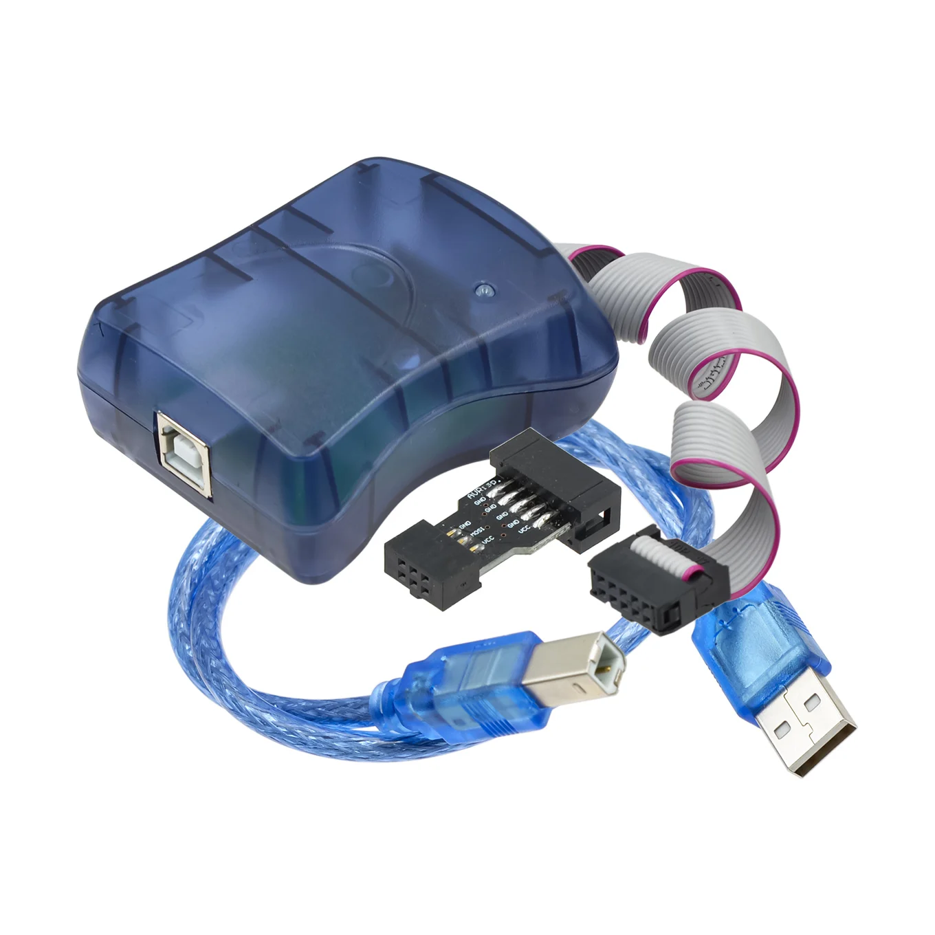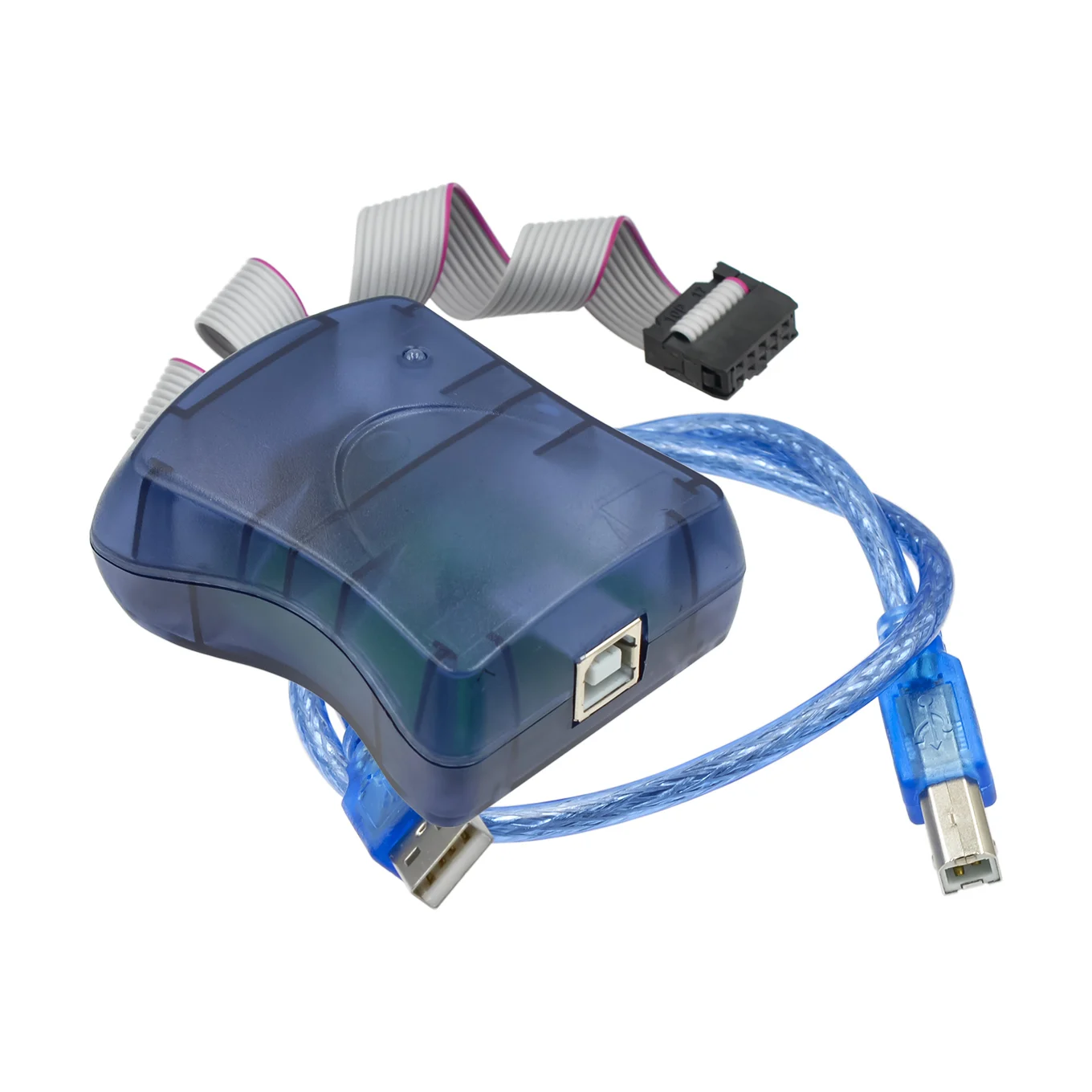 Experience seamless microcontroller programming with this sleek and modern AVR ISP programmer. Encased in a translucent blue plastic shell with smooth, rounded edges, it offers a refined and professional look. The device features a white flat ribbon cable with pink edges, providing a vibrant contrast that highlights its technical precision. Two black connectors with multiple gold pins allow for reliable interfacing with AVR microcontrollers and compatible boards. Designed for durability and efficiency, this in-system programmer is ideal for productive, hands-on projects. Whether you’re updating firmware or developing new applications, this device ensures smooth connectivity and stable operation. Its compact size makes it easy to handle, making it an essential tool for any electronics enthusiast or professional programmer aiming for accuracy and speed in their work.
