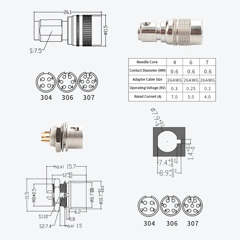 Experience the reliability and precision of this range of aviation connectors designed for industrial camera power applications. Crafted with attention to detail, these connectors feature a sleek, metallic silver finish, showcasing a professional and durable aesthetic. They are available in various configurations—4-pin, 6-pin, 10-pin, and 12-pin—allowing you to select the perfect fit for your specific needs. The connectors include male plugs, female sockets, and soldering types, all engineered to ensure secure, high-quality connections. The textured grip areas provide ease of handling, while gold-plated contacts add to their durability and electrical conductivity. Ideal for demanding industrial settings, these connectors combine advanced technical specifications with a clean, industrial style.