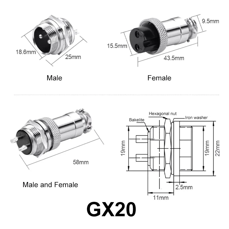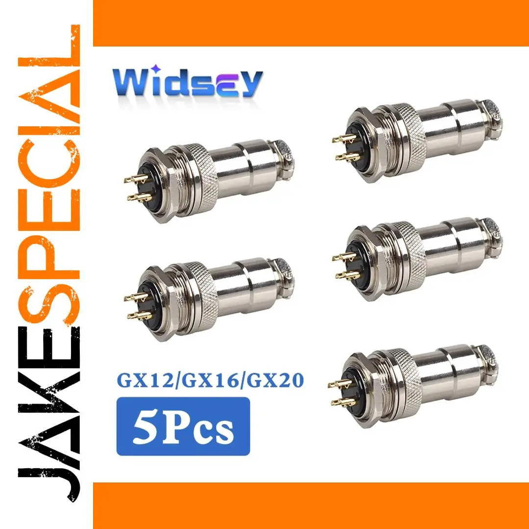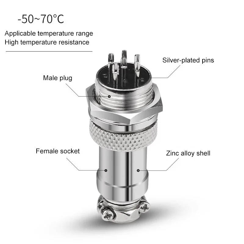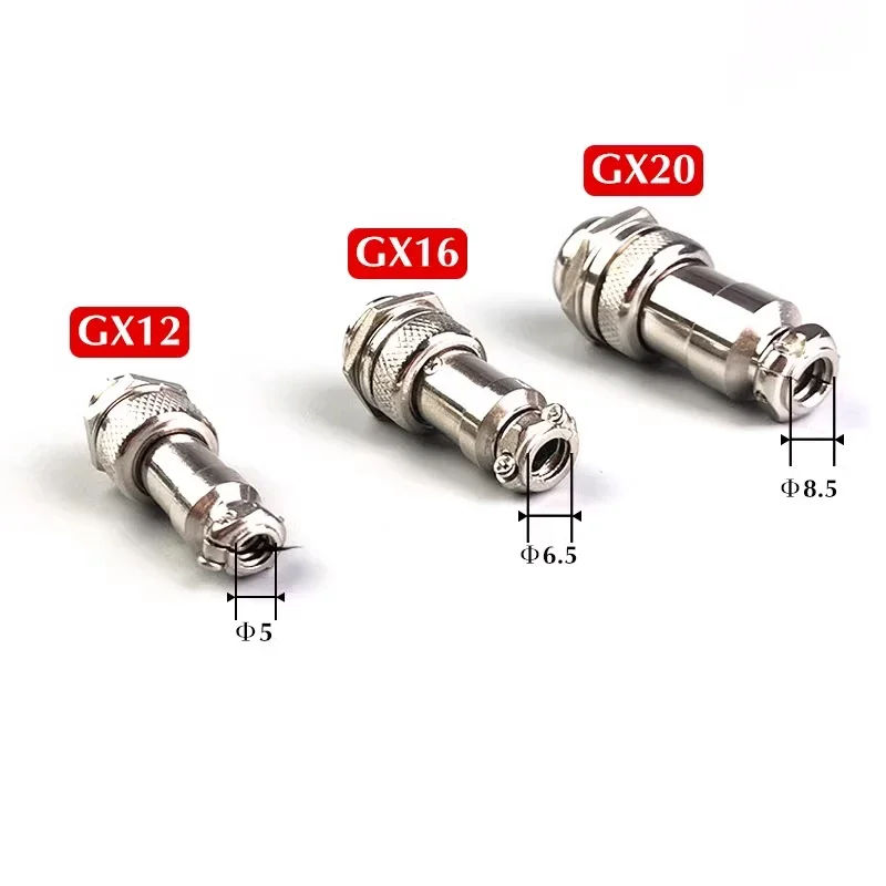 Enhance your electrical connections with this set of male and female aviation connectors, featuring GX12, GX16, and GX20 models in 2 to 7-pin configurations (2P, 3P, 4P, 5P, 6P). Rated at 5A and 125V, these durable connectors have polished, silvery metallic cylindrical bodies with threaded knurled outer sections for secure fastening. Black insulating caps surround gold-colored pins, providing excellent conductivity and corrosion resistance. Included are five pairs of connectors designed for reliable cable and power joint applications, combining robustness with a sleek, professional appearance perfect for high-quality electrical setups.