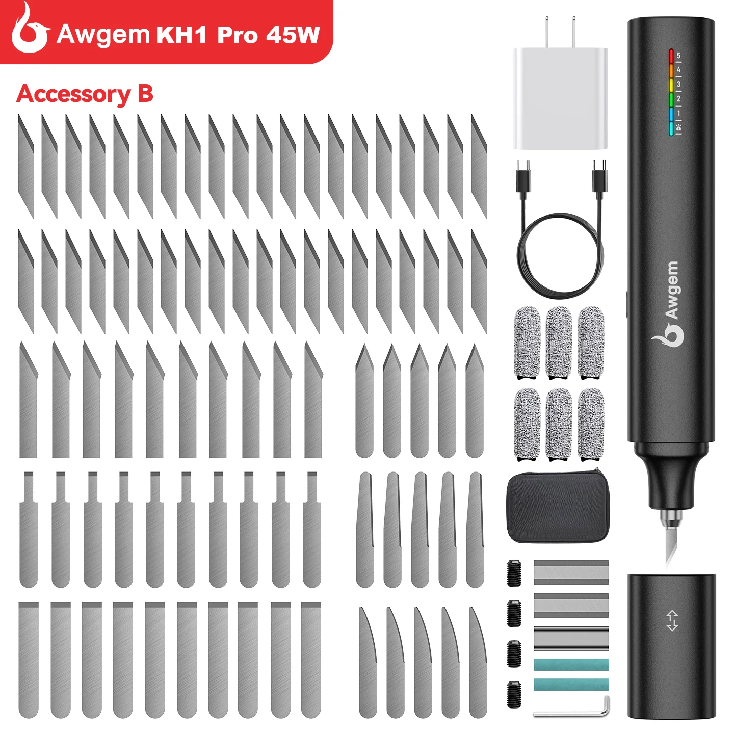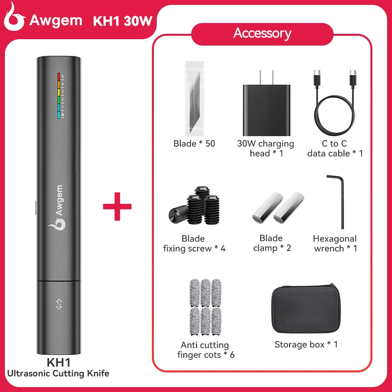 The this Awgem KH1 ultrasonic cutter features a modern, stylish design with a matte black body accented by subtle metallic details around the sharp, pointed steel blade. Its ergonomic handle, crafted from durable plastic, is seamlessly shaped for comfortable grip and control during detailed carving and cutting. The device’s slender blade protrudes slightly, illuminated by a blue light, highlighting its precision and technological sophistication. Five vibrant LED indicators run vertically along the side, allowing easy adjustment of power or gear settings. Weighing only 120 grams and measuring 19.15 centimeters in length, this lightweight, portable tool is ideal for cutting a wide variety of materials, including plastics, resin, textiles, and more, making it an essential device for DIY enthusiasts and professional creators alike.