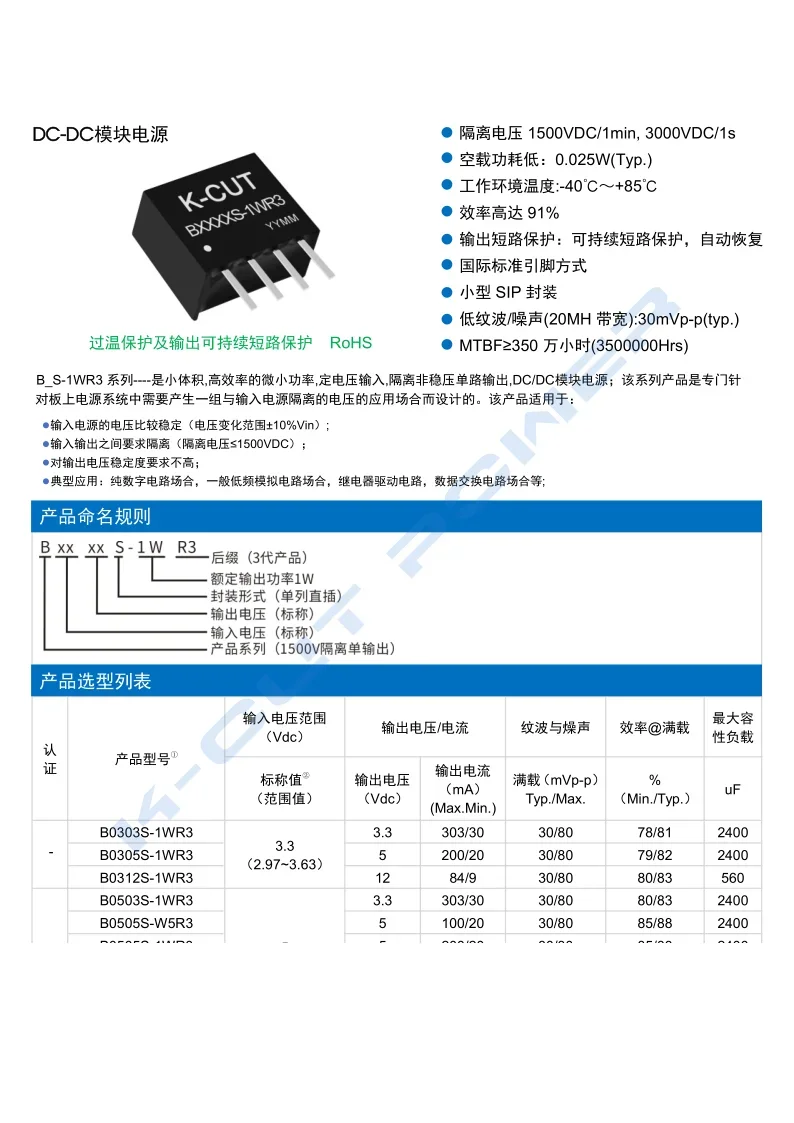 - Technical specifications include input voltage: 12V DC, output voltage: 24V DC, output power: 1W, with models designed for streamlined integration in various electronic systems.