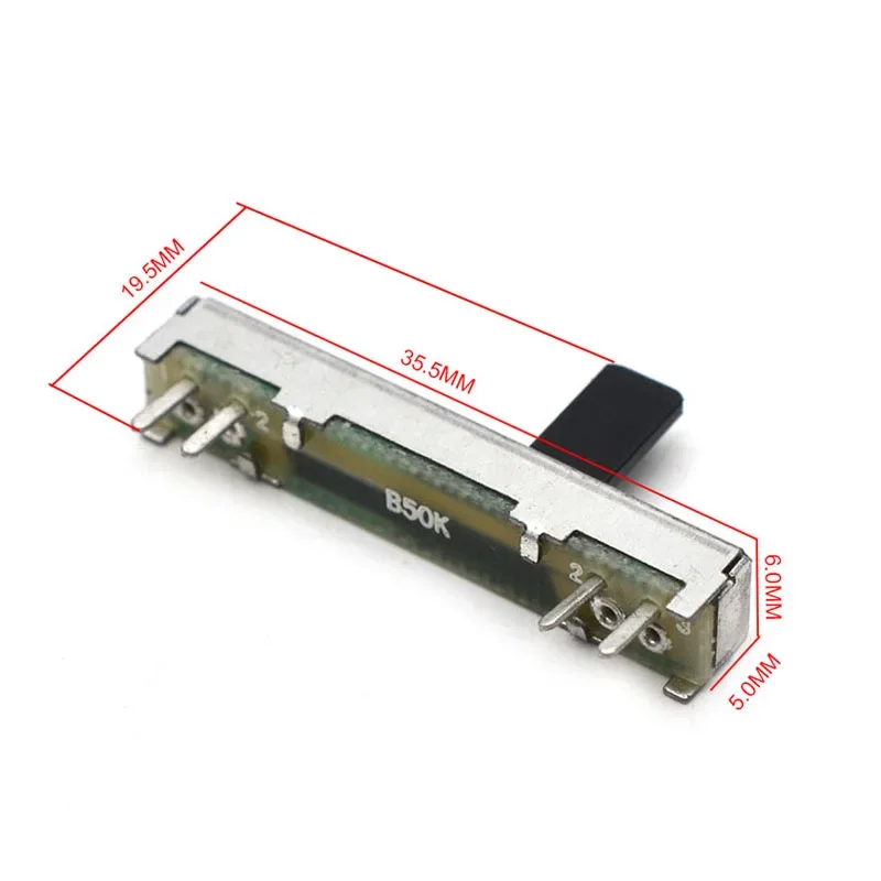 Experience precise electrical adjustments with these high-quality GETMUSIC slide potentiometers, model MU2072, featuring a resistance of 50K ohms (B50K). Crafted from durable metal, each unit measures 35.5mm in length, 6.0mm in width, and 5mm in height (pins not included), with a total height of 19.5mm. Designed for versatile applications such as equalizer repairs and guitar electronics, these sleek rectangular components showcase a silver finish and a slim profile, complemented by a green circuit track window for visual reference. The sturdy black slide adjustment tab ensures easy manipulation, making these potentiometers both reliable and user-friendly for your electronic projects.