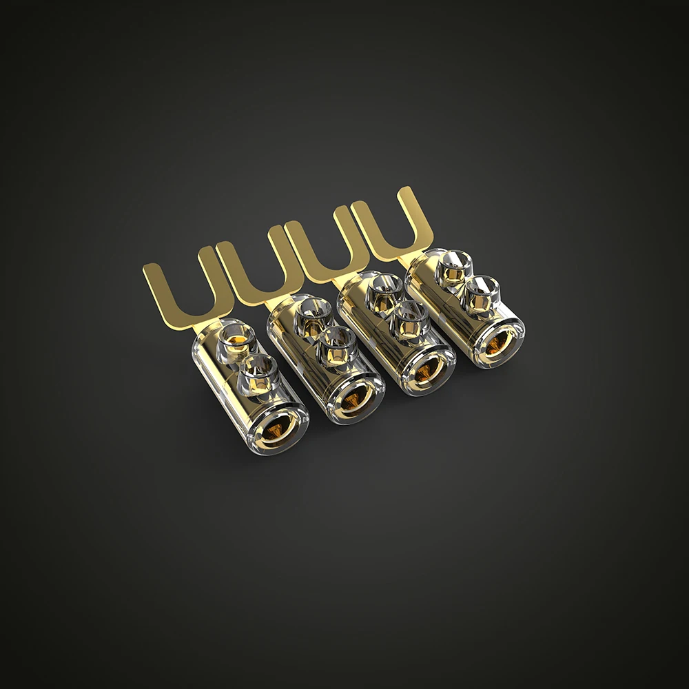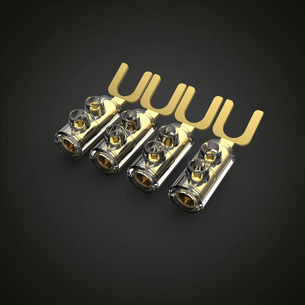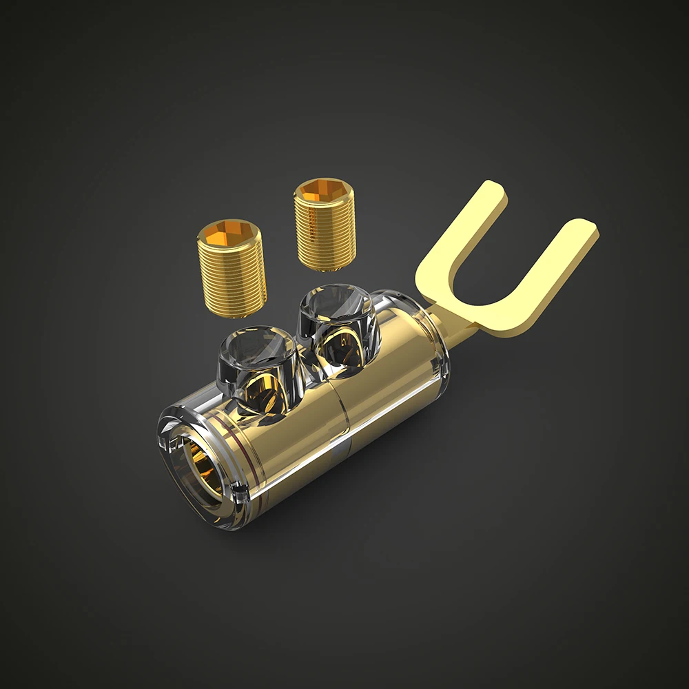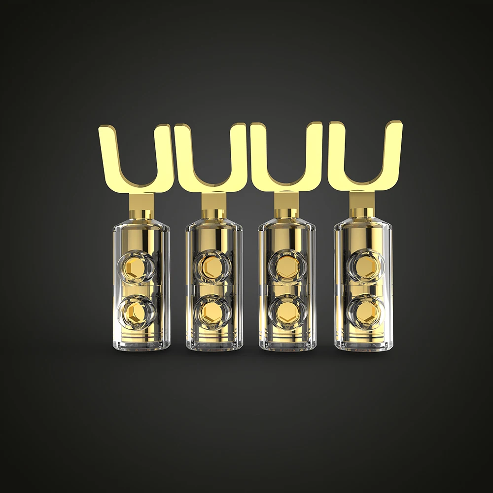 Experience premium audio connectivity with these high-quality banana plug connectors featuring a 14.67mm diameter and 44.8mm overall length. Made from durable brass with a 24K gold plating, they offer excellent conductivity and corrosion resistance. Supporting wire diameters up to 5.5mm, each plug is secured with double hex screws for a reliable connection. The transparent nylon and fiberglass housing, highlighted by a stylish red and black color scheme, ensures polarity is clearly indicated. This set of four male banana plugs is ideal for high-fidelity audio cable applications, providing a secure, stylish, and dependable connection for your audio system.