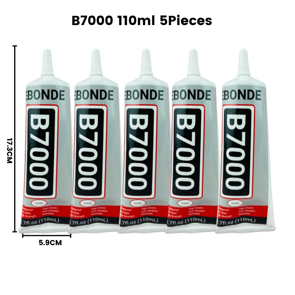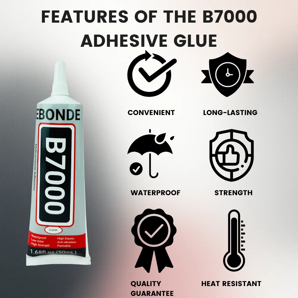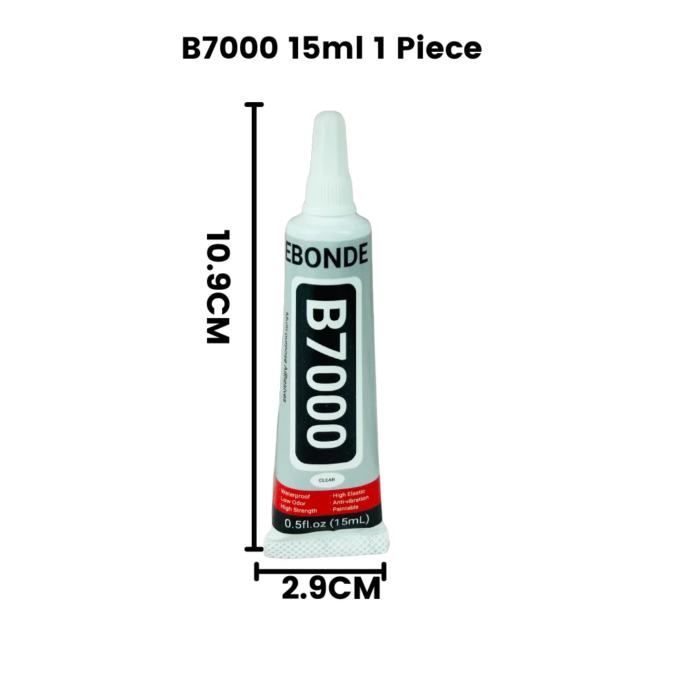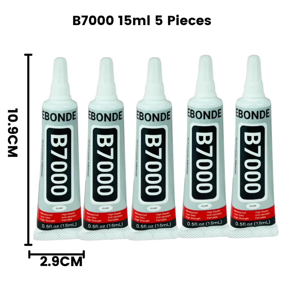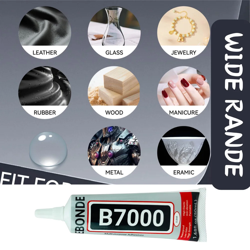 Experience reliable bonding with EBONDE’s B7000 Strong Glue, available in 15ML, 50ML, 110ML, and 25ML sizes, offered in single or multi-piece sets. Designed for versatile applications, this high-strength liquid adhesive bonds metal, glass, wood, fabric, ceramic, plastics (PP, PE, PVC), jewelry, electronic components, paper, leather, and crafts. Its sleek, modern tubes feature a light gray matte finish with bold black “B7000” lettering, a white cap, and a vibrant red section highlighting “Waterproof,” “Low Odor,” and “High Strength” for added confidence. Quick initial setting in 1-2 minutes, with full cure in 48 hours, making it ideal for DIY repairs and creative projects.