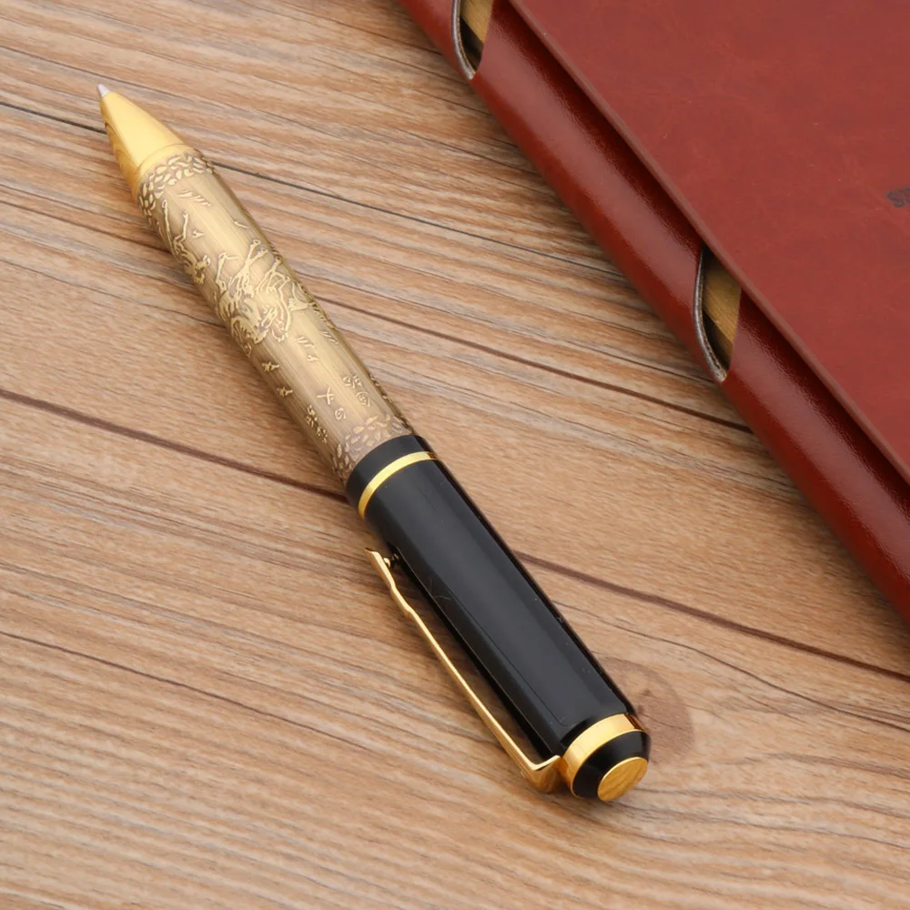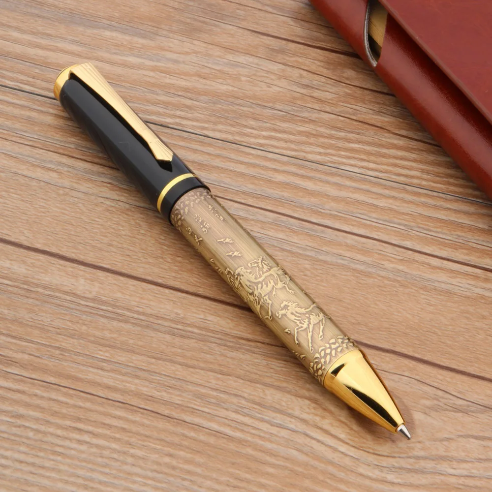 Discover the timeless beauty of the this luxury BAOER 507 ballpoint pen, crafted for those who appreciate art and sophistication. With its ornate design inspired by traditional Chinese painting, it features a detailed gold engraving of a horse surrounded by floral and landscape motifs. The sleek black metallic body contrasts beautifully with shimmering gold accents on the clip, tip, and top end, creating an elegant, distinguished look. Weighing approximately 35 grams, this durable writing instrument offers a smooth, precise 0.7mm ink point perfect for office or academic use. Its ornamental yet practical design makes it an ideal gift or personal accessory for lovers of cultural artistry and refined craftsmanship.