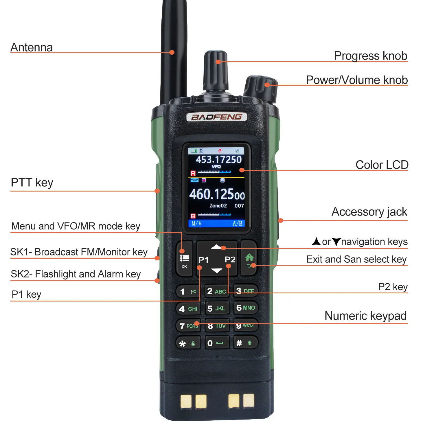 - Supports up to 1000 programmable channels with 25.0KHz and 12.5KHz spacing, plus features like VOX, dual watch, emergency alarm, and custom side keys.