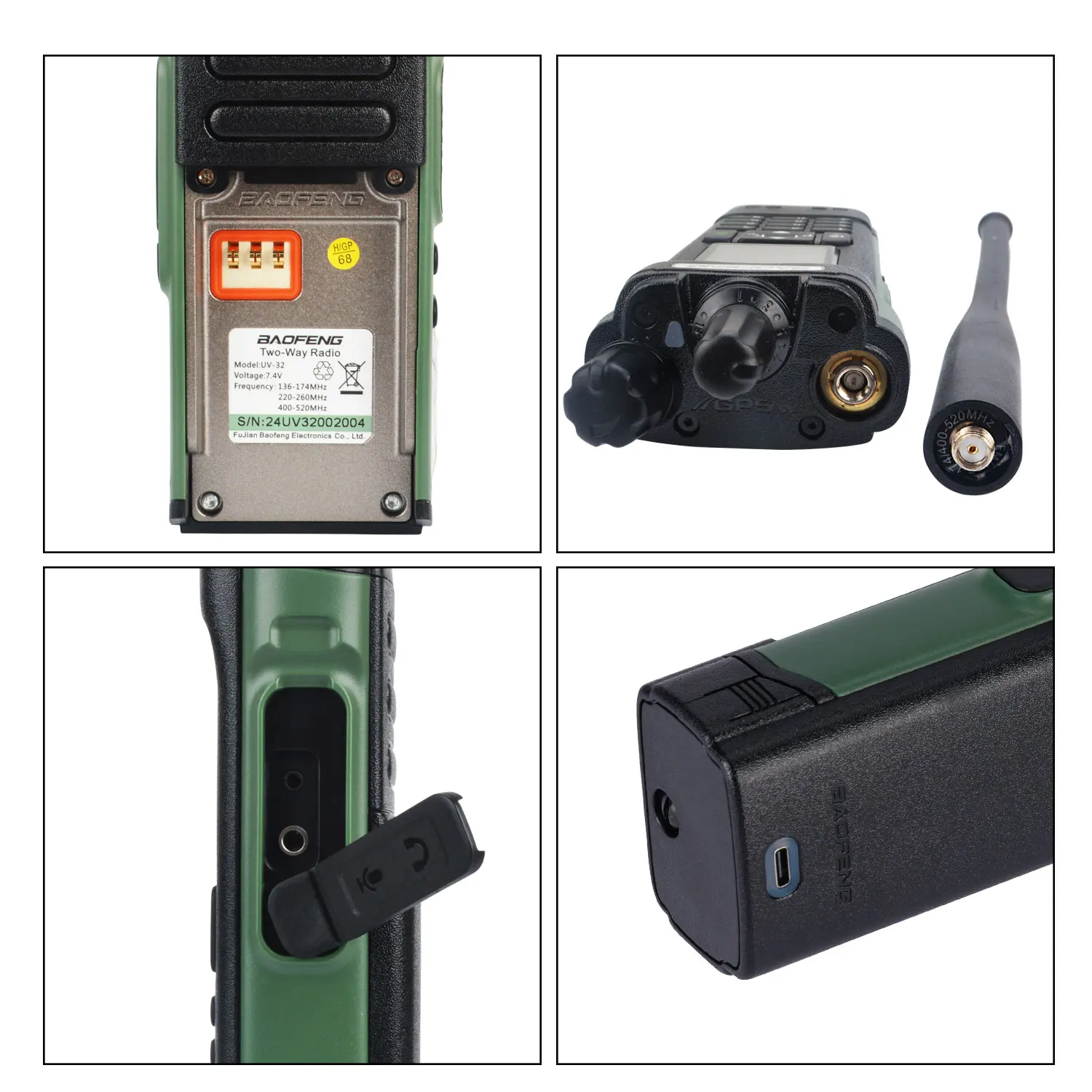 Imagine having reliable communication at your fingertips with this sleek Baofeng UV-32 walkie talkie. Its modern rectangular design features rounded edges and a durable textured plastic exterior, enhanced by vibrant green accents along the sides, offering a rugged yet stylish appearance. The bright 2.0-inch HD display provides crisp, colorful visuals of frequency information, signal strength, and icons, making navigation effortless. Equipped with GPS for real-time location sharing, Bluetooth connectivity, and support for manual, app, or PC programming, this device is ideal for outdoor activities, emergencies, or professional use. Its compact form fits comfortably in your hand, ready to deliver clear voice communication over distances of 5-10 kilometers with impressive power and advanced features.