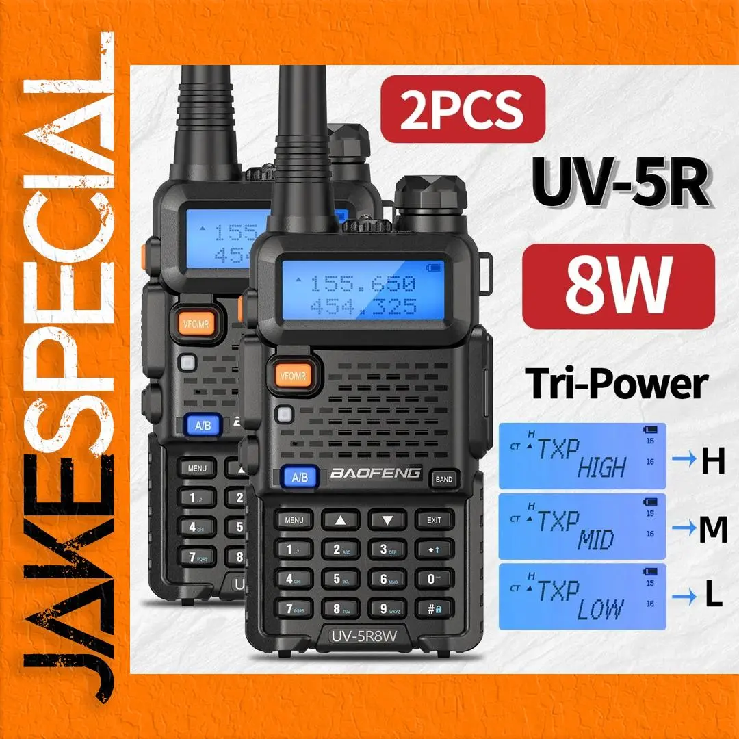 Experience seamless communication with the Baofeng UV-5R handheld dual-band FM transceiver walkie talkie. Engineered for versatility, this device operates on VHF (136-174 MHz) and UHF (400-520 MHz) frequencies, ensuring you stay connected in diverse environments. With an output power range of 1W to 8W, it boasts a maximum range of up to 16 kilometers under optimal conditions. Its robust design, complete with a black textured finish for improved grip, ensures durability for outdoor adventures. The user-friendly interface features a blue illuminated LCD, ample storage for 128 channels, an SOS alarm for emergencies, and built-in features that cater to your communication needs – perfect for both leisure and survival.