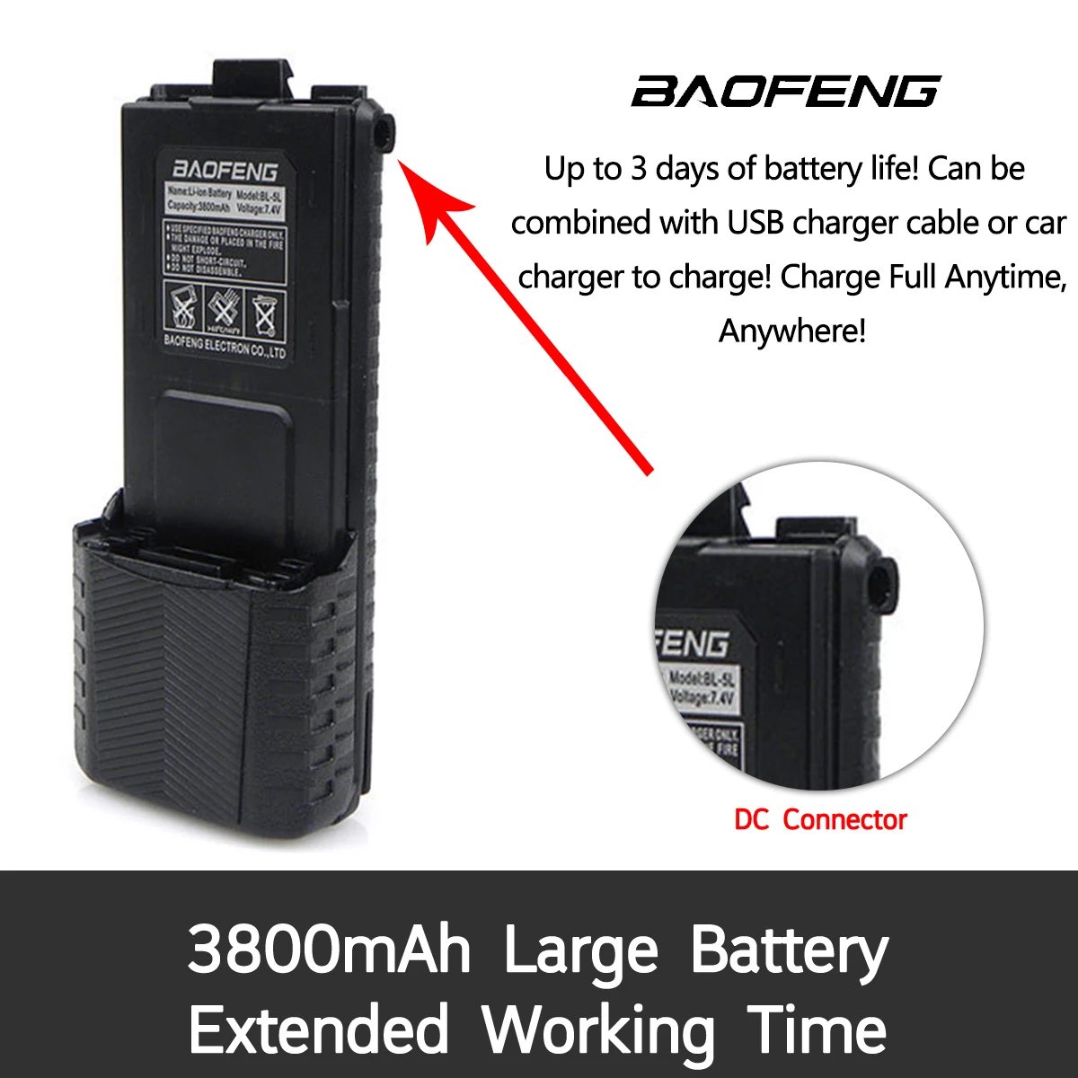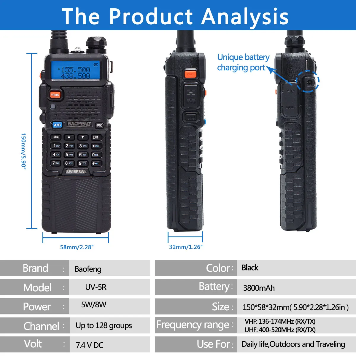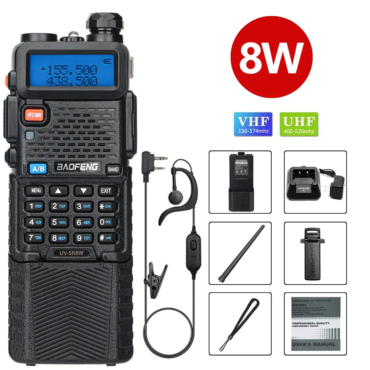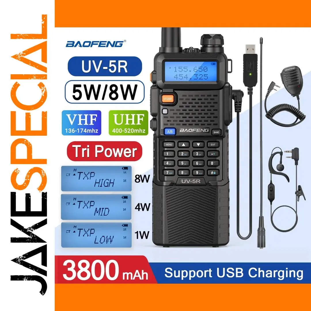 Experience reliable communication with the Baofeng UV-5R dual-band portable radio, featuring VHF 136-174 MHz and UHF 400-520 MHz frequencies. Equipped with adjustable 5W to 8W output power and a robust 3800mAh rechargeable Li-ion battery, it offers up to 128 programmable channels, dual display and standby, and independent A/B band operation. Key features include scan, emergency alarm, VOX with 0-9 grades, FM radio with 25 stations, and comprehensive CTCSS/DCS encoding. Its compact design measures 115 x 57 x 38 mm, operating efficiently in temperatures from -20°C to +50°C, with an IP45 waterproof rating for durability in various environments.