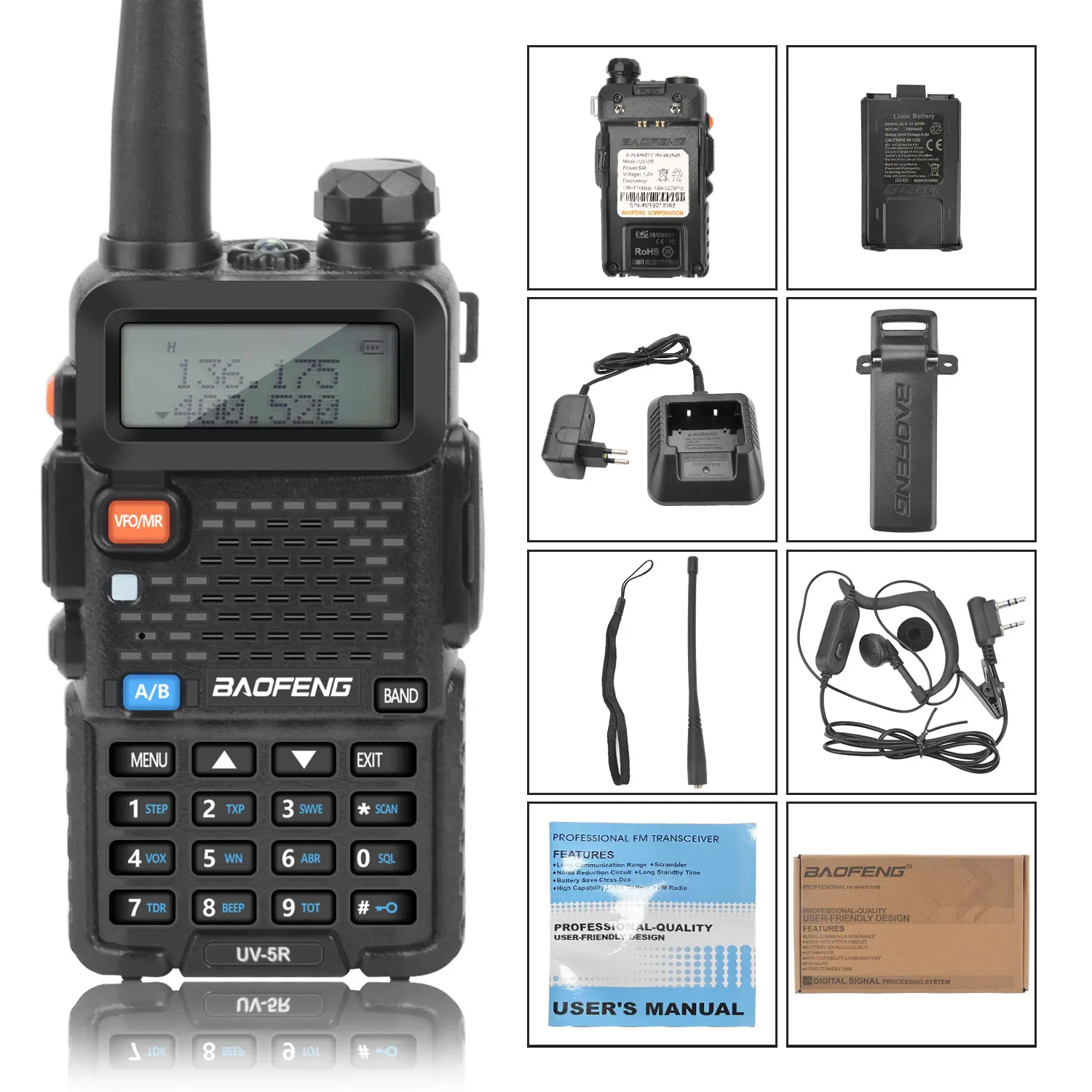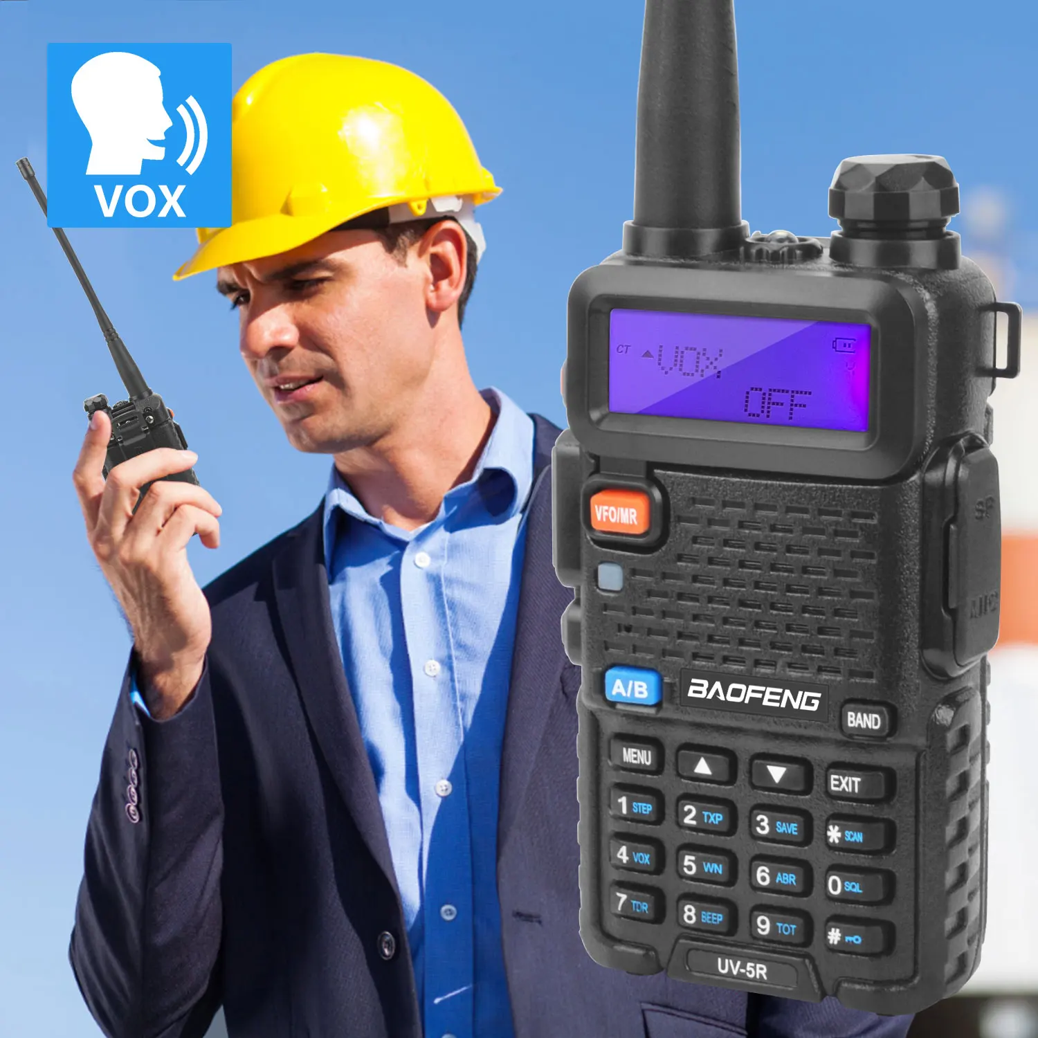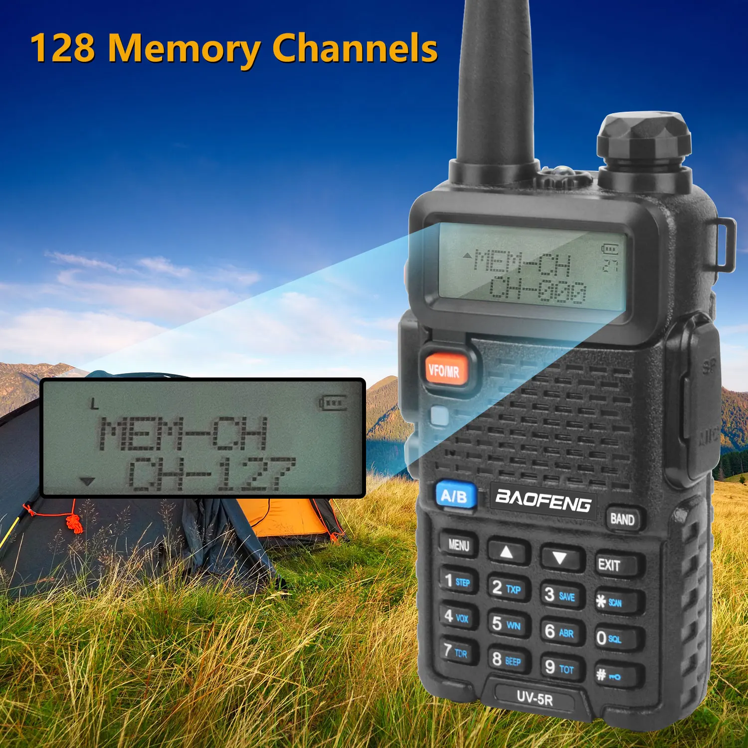 Experience seamless communication with this high-performance Baofeng UV-5R dual-band walkie-talkie. Crafted in sleek black, its compact rectangular design features textured plastic for a sturdy grip. The device boasts a flexible whip antenna that extends upward for superior signal reception, complemented by large, easy-to-turn knobs for volume and frequency adjustments. The small monochrome LCD display is simple and unobtrusive, while vibrant orange and blue buttons add functional contrast. With up to 128 memory channels, adjustable frequency steps from 2.5 to 50.0 KHz, and multiple digital features, this walkie-talkie is perfect for professional or recreational use. Its ergonomic design and advanced capabilities make it a trusted companion for clear, long-range communications. Visualize yourself enjoying uninterrupted connectivity during your adventures or work tasks, effortlessly managing multiple channels and settings. This device’s reliable performance builds confidence for every use scenario, transforming your communication experience.