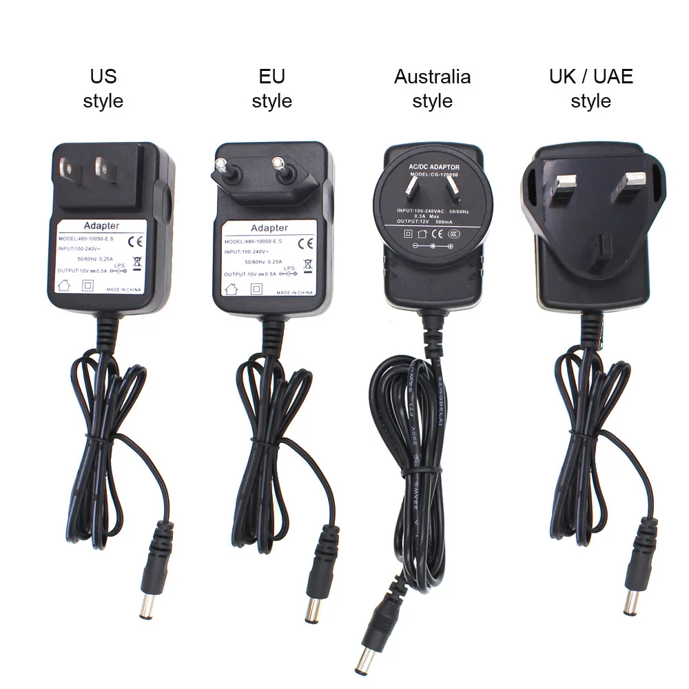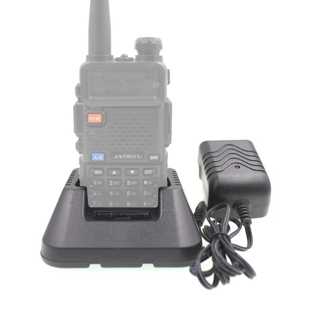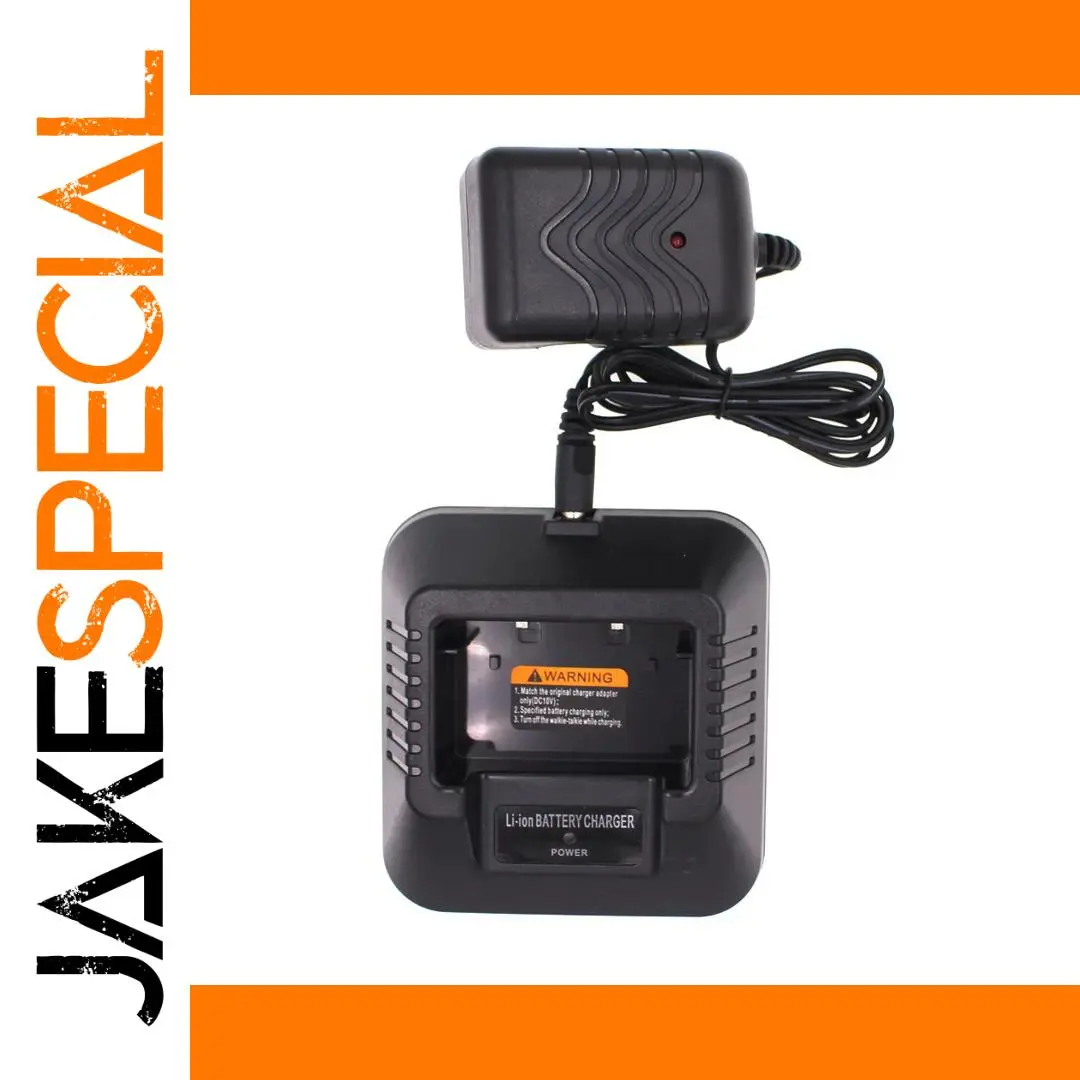 The Original Charger for BAOFENG UV-5R series two-way radios, including models UV-5R, DM-5R, UV-5RA, and UV-5RB, features a sleek square design with a glossy black plastic exterior. It operates on an input of AC 100-240V at 50-60Hz and delivers an output of DC 10V at 500mAh. The charger includes a prominent battery slot with two metal contacts and a red LED indicator light to show charging status. Available with four regional plug types (EU, AU, US, UK), this desktop charger combines functionality with a user-friendly design, ensuring compatibility and convenience for your charging needs.