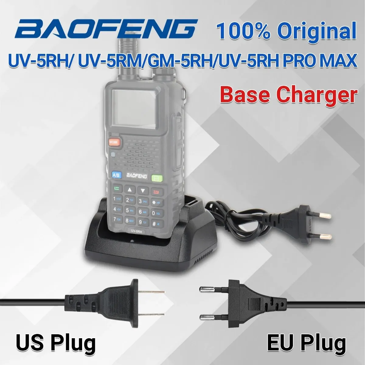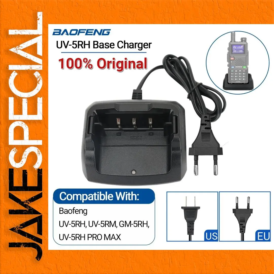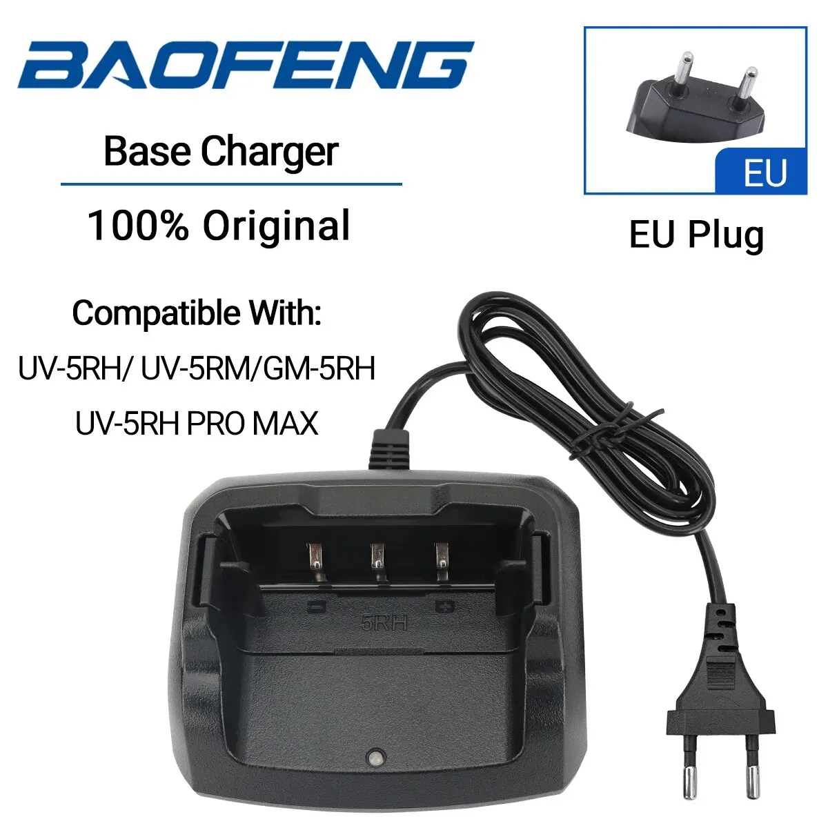 The Baofeng UV-5RH Desktop Base Charger is the perfect addition to your two-way radio accessories. Designed specifically for models like the UV-5RH, UV-5RM, GM-5RH, and UV-5RH PRO MAX, this charger combines functionality with sleek aesthetics. With its compact matte black base, highlighted by three metallic charging contacts, it ensures your device is powered up when you need it most. Enjoy the convenience of a charger that features both red and green LED indicators for clear charging status. With input voltage ranging from 100-240V AC, it's suitable for global use with both EU and US plug options available.