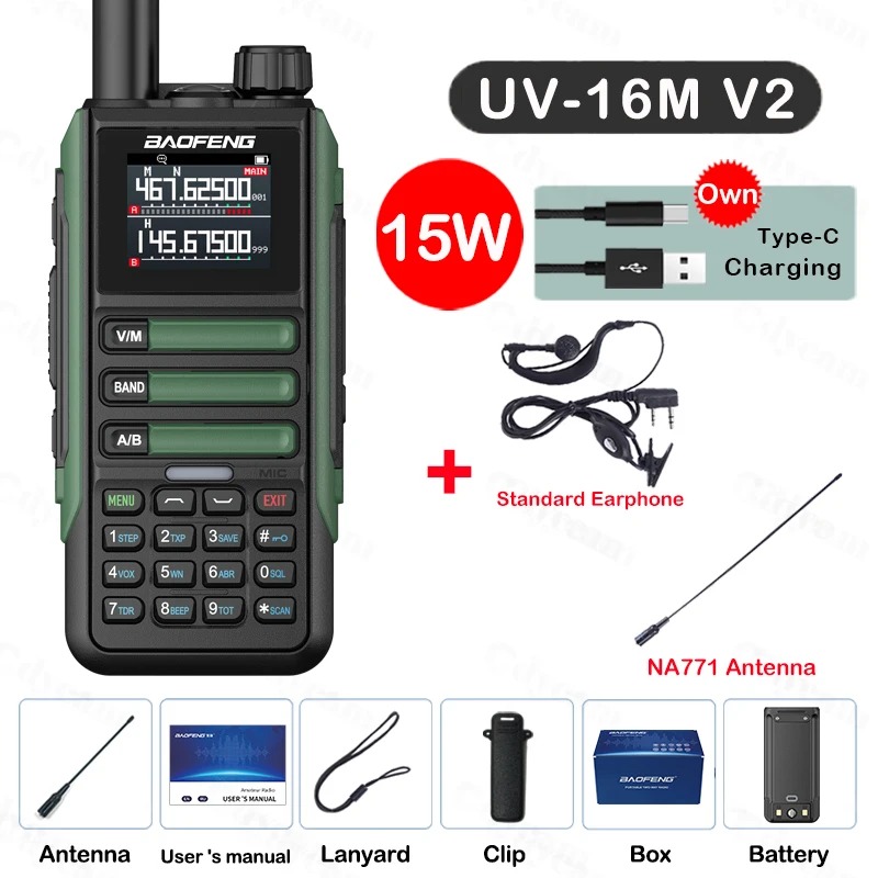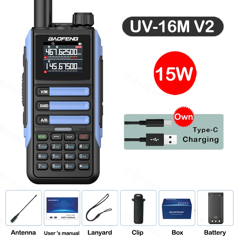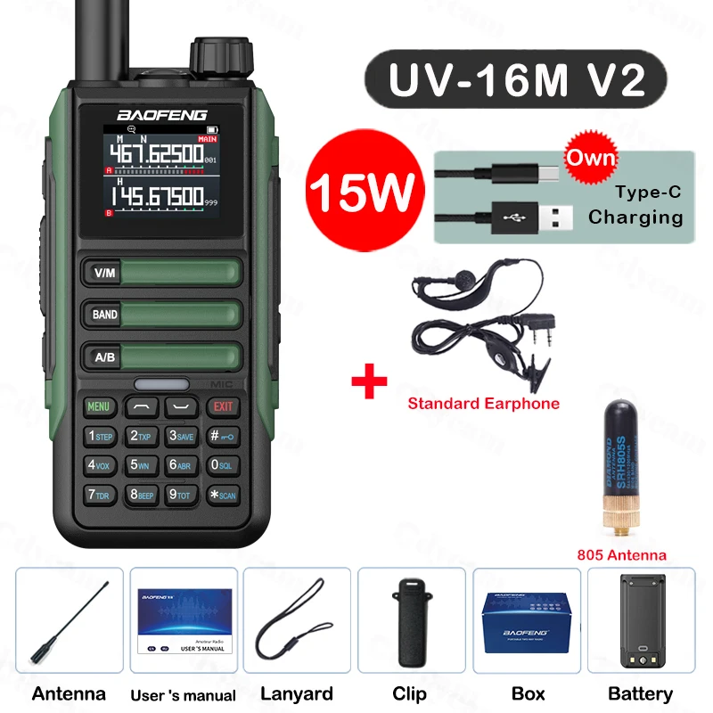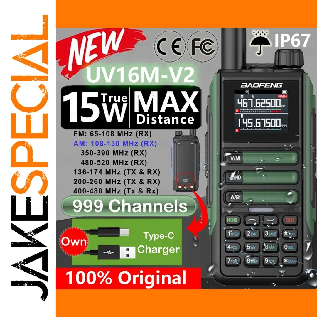Experience reliable communication with the Baofeng UV16M V2 Walkie Talkie, a powerful 15W two-way radio designed for long-range clarity and versatility. Featuring a full band LCD display and 999 memory channels, it covers a wide frequency range of 65-520MHz, including NOAA weather channels, police, FM, and airband frequencies. Built with IP67 waterproof resistance and a high-capacity battery, it ensures durability and extended usage in demanding environments. Ideal for enthusiasts, adventurers, and professionals, this portable radio offers noise reduction, dual-band operation, and a user-friendly interface, making it your go-to device for dependable, crisp communication in any situation.