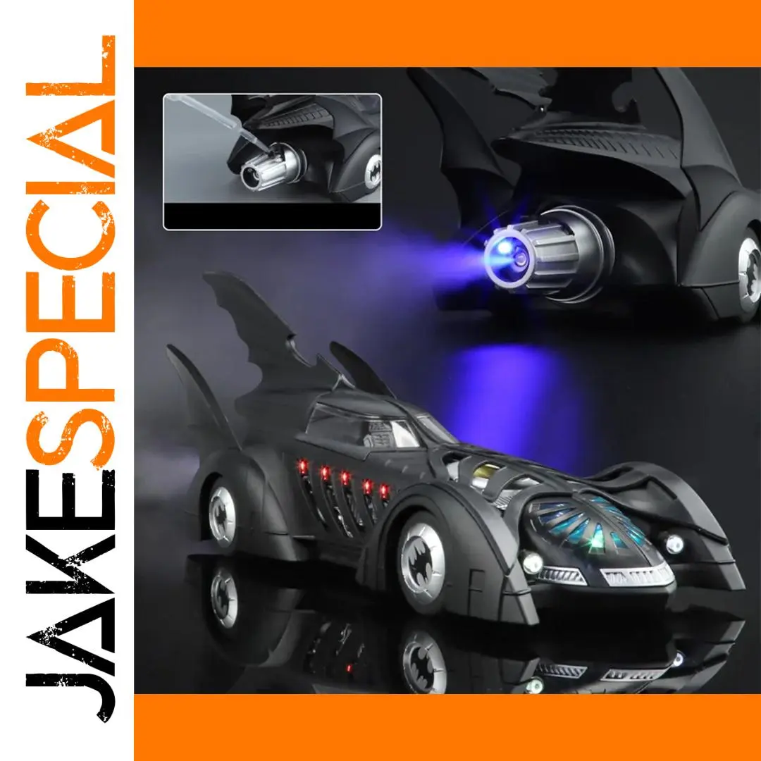 Experience the thrill of owning a highly detailed replica of the iconic Batmobile from classic movies. With its sleek black finish and aggressive, aerodynamic design, this model exudes power and futuristic appeal. The intricate sculpted details, including vents, intakes, and armor plating, make it a standout piece for collectors or enthusiasts. Bright white LED lights integrated into the front bumper and red LED accents on the sides enhance its high-tech aesthetic, while illuminated blue lights add a dynamic glow. The iconic bat wing fins extend from the rear, giving it a dramatic silhouette. Crafted from durable alloy and plastic, this model captures every subtle detail, making it a stunning display piece for any collection.