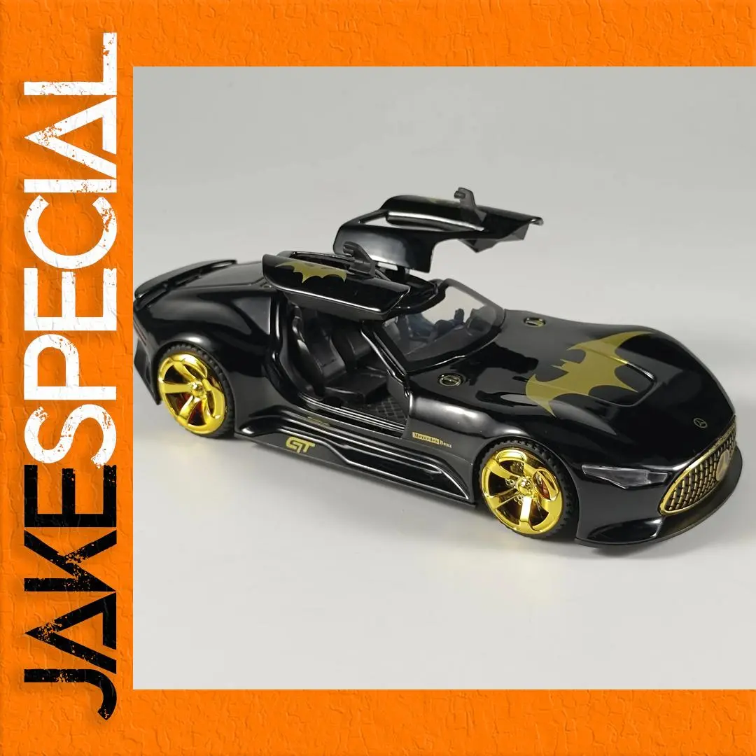 Introducing the 1:32 scale Batmobile Vision GT AMG Super Concept Car model, crafted from high-quality diecast metal alloy. This stunning model features a sleek glossy black finish with striking gold accents, including a unique “bat” symbol and large alloy wheels with detailed spokes. Its bold front grille and aerodynamic design suggest speed and performance, while the tinted windows reveal a meticulously detailed cockpit. Enjoy interactive sound and light functions powered by a button battery, making it a captivating addition to your collection. Available in various color options, including Black, Silver, and distinctive themed boxes, this model is perfect for any enthusiast.