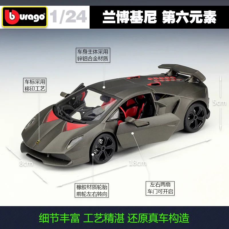 - This diecast alloy model features a precise 1:24 scale representation of the Lamborghini Sesto Elemento, capturing the car’s elegant and aggressive design in stunning detail, perfect for display and collection.
