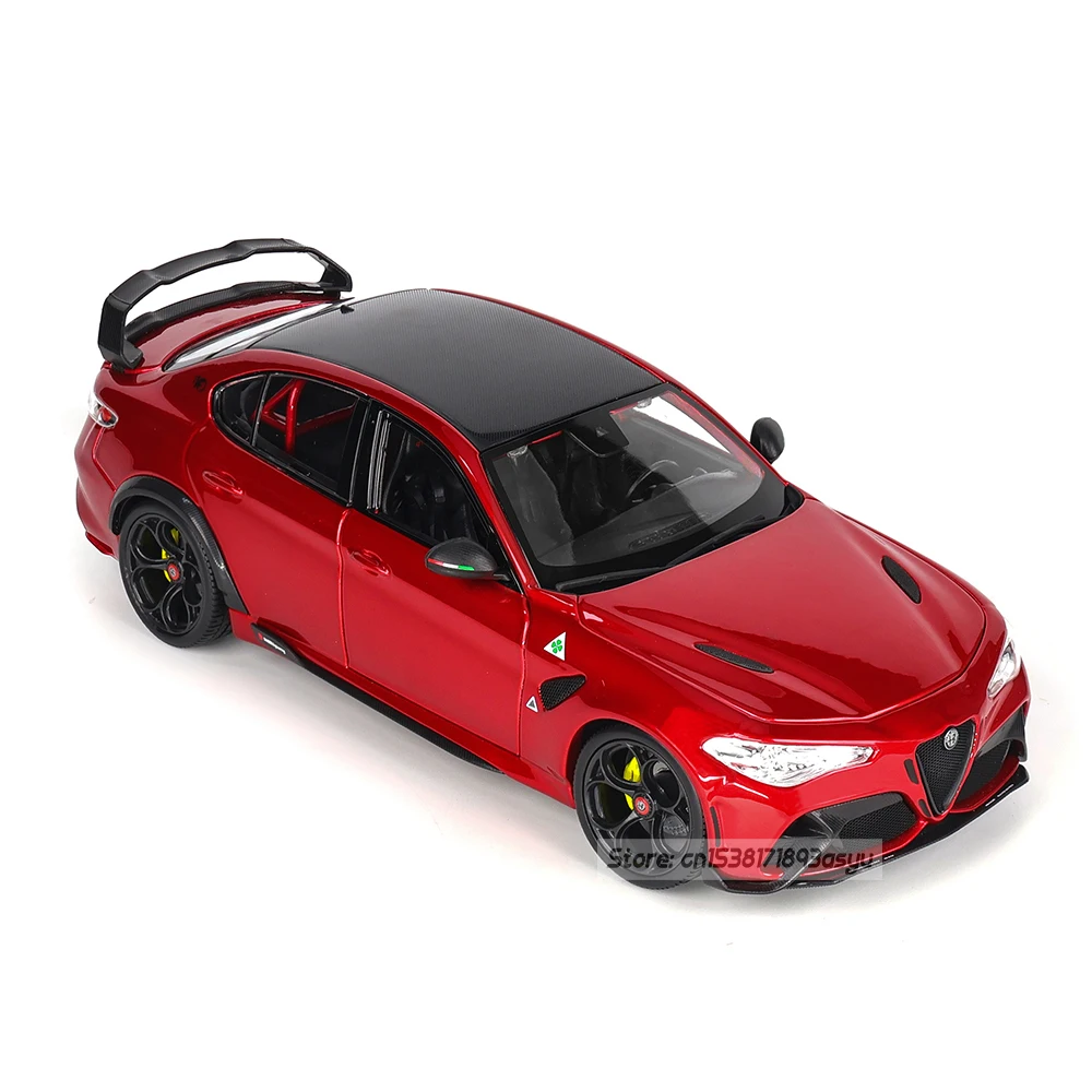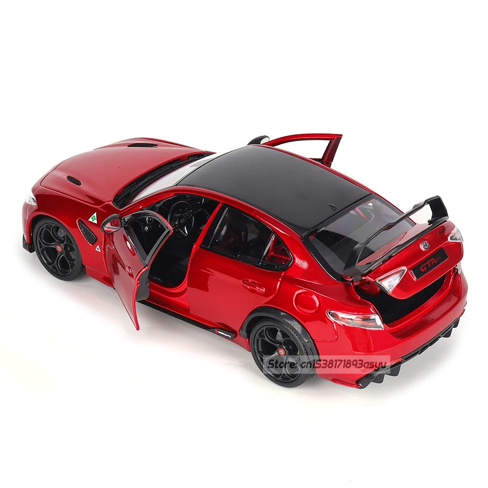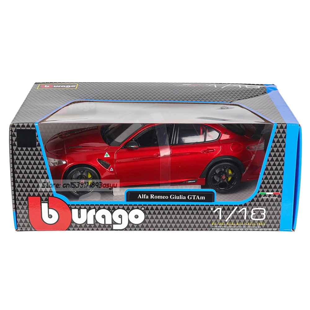 The Bburago 1:18 scale diecast model of the Alfa Romeo Giulia GTAm #99 features a breathtaking bright red body complemented by a sleek black roof. With an aerodynamic design showcasing smooth curves and sharp angles, this model captures the essence of racing. The glossy finish enhances its visual appeal, while the detailed engine, visible through the hinged hood, exemplifies fine craftsmanship. Robust black multi-spoke wheels mounted on a sporty chassis complete its impressive stance, making it a perfect addition to any collection. Bring home this iconic model and let it take center stage on your display.