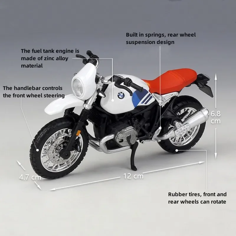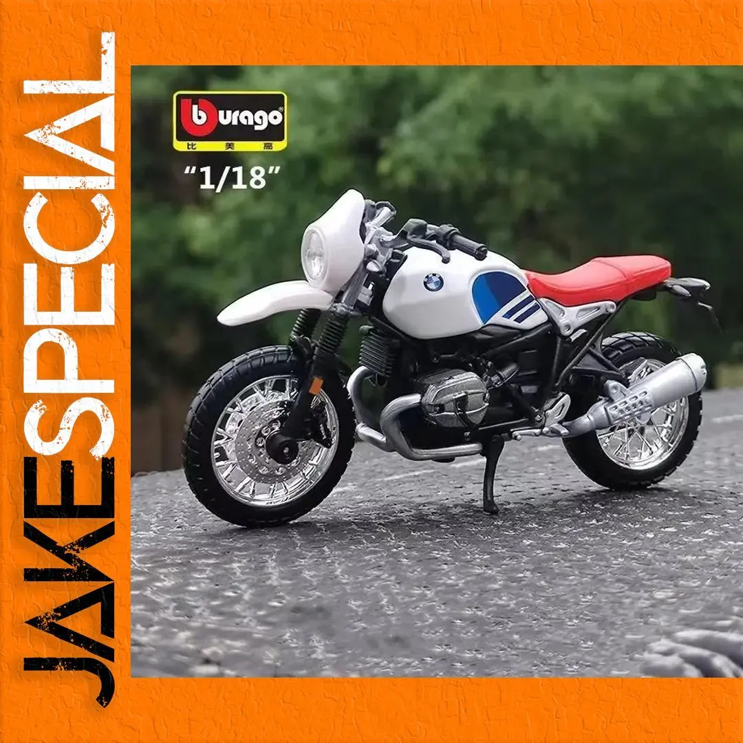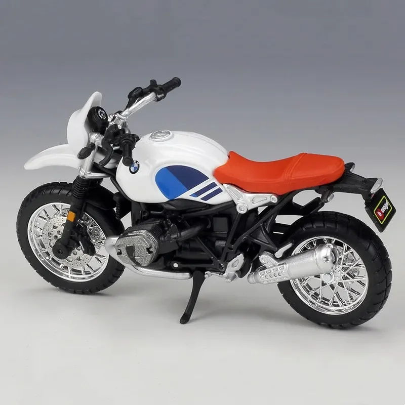 Introducing the Bburago 1:18 BMW R nineT Urban GS diecast motorcycle model, a stunning representation of classic BMW design. This model features a sleek white body with a striking red seat and iconic blue and white side stripes. Constructed from high-quality alloy and plastic, it showcases intricate details, including a prominent circular headlight, chrome-accented engine, and sturdy metallic silver rims with a spoke pattern. The rugged, thick tires and high-set handlebars emphasize its adventure-ready styling. With a scale of 1:18 and no batteries required, this finely crafted motorcycle model is perfect for enthusiasts and collectors alike.