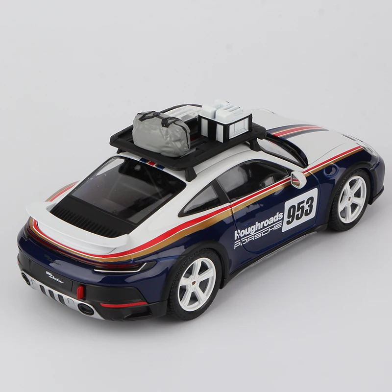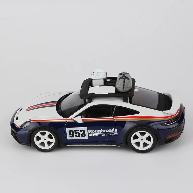 The Bburago 1:24 scale die-cast model of the Porsche 911 Dakar combines stunning design with exceptional detail. Finished in a glossy white with a deep blue lower section, it features eye-catching red and yellow racing stripes that ignite a sporty vibe. Meticulously crafted, it showcases detailed headlights, a prominent grille, and rally-themed decals including a large “953” and “Roughroads” branding. The functional roof rack, carrying a duffel bag and a rectangular box, adds to its adventurous appeal. Its dimensions and quality materials ensure that every enthusiast can proudly display this stunning model in their collection.