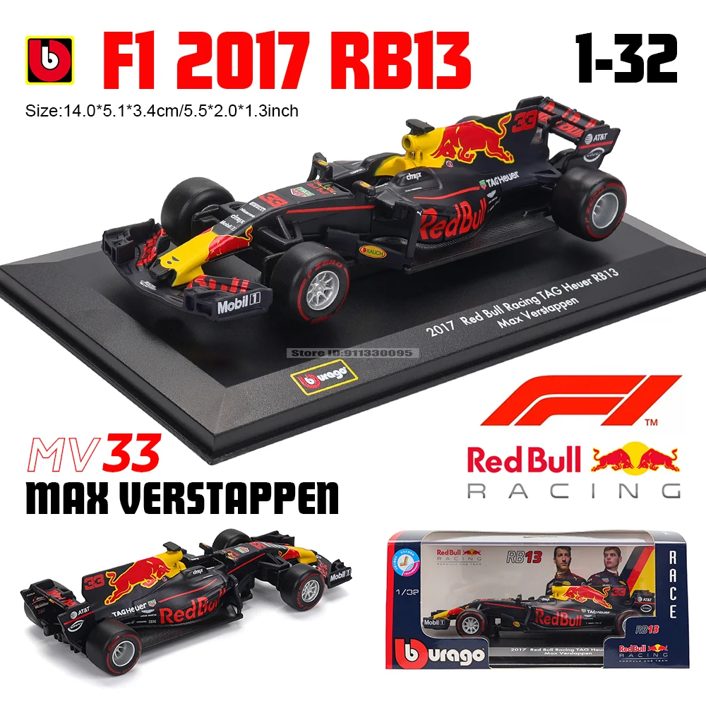 The Bburago 1:32 scale model of the Red Bull Racing Formula One 2017 RB13 is a stunning diecast replica featuring a striking black body with vibrant red and yellow accents, showcasing the iconic Red Bull logo. Measuring approximately 5″, this model is crafted from high-quality zinc alloy with plastic parts and rubber tires, providing a realistic finish. It includes a strong pull-back mechanism that propels the car up to 20 meters (65.6 ft) on a smooth surface. The interactive design allows you to open the doors and hood, revealing a detailed interior, making it perfect for collectors, gifts, or decorative displays.