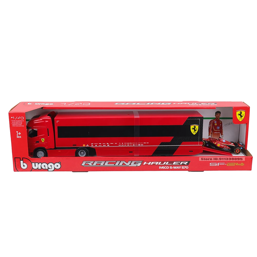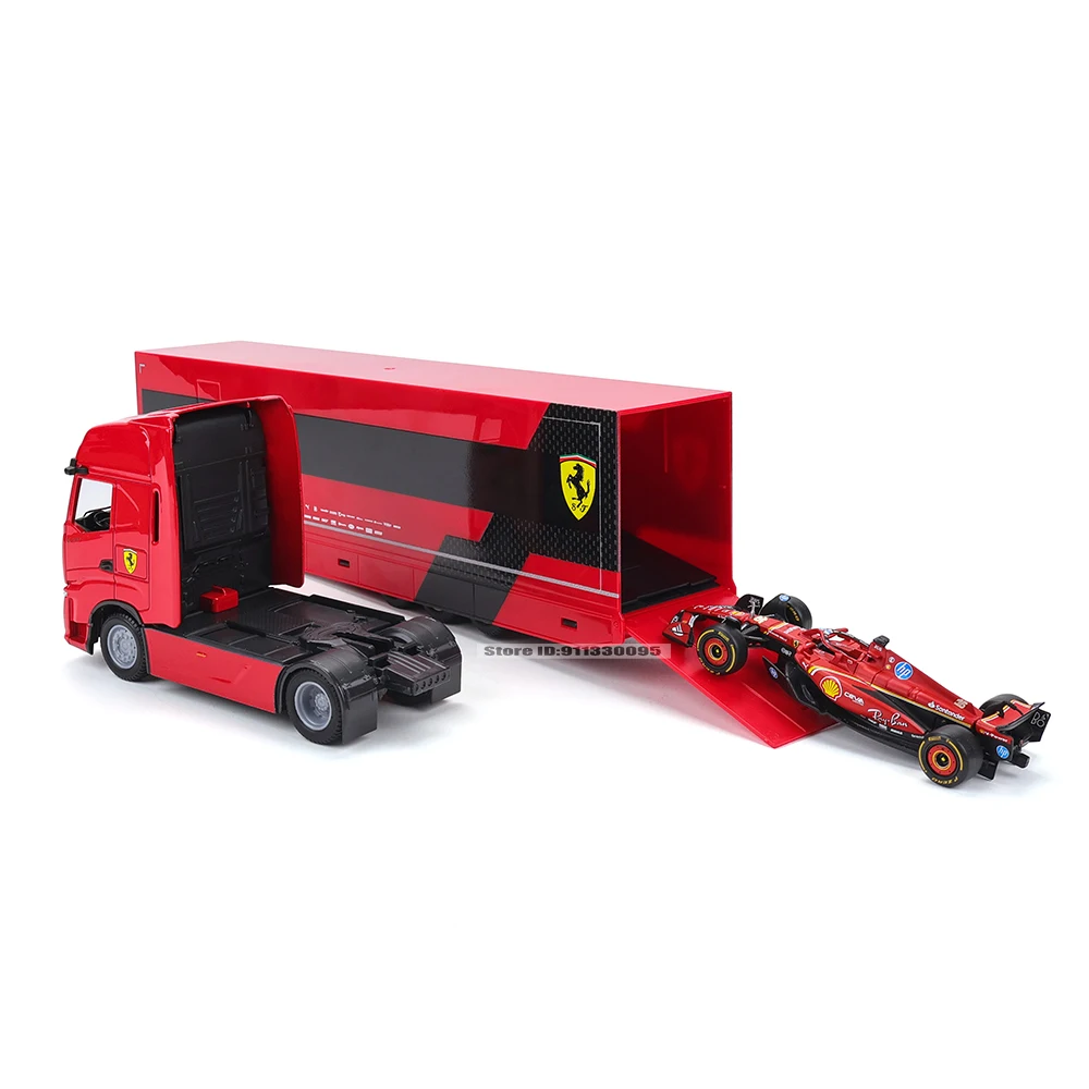 The Bburago 1:43 Ferrari SF24 2024 F1 Hauler Set features a striking red diecast model of a racing semi-truck and a Ferrari SF24 race car, both showcasing modern and sporty designs. The truck, adorned with the iconic Ferrari emblem, includes a sculpted front grille, detailed headlights, and an aerodynamic cabin, while its trailer boasts a smooth red finish with a black stripe. The Ferrari SF24 car complements the truck with intricate detailing, sponsor logos, and wide tires characteristic of Formula One vehicles. This collector’s set delivers a premium representation of motorsport excellence in a compact 1:43 scale.