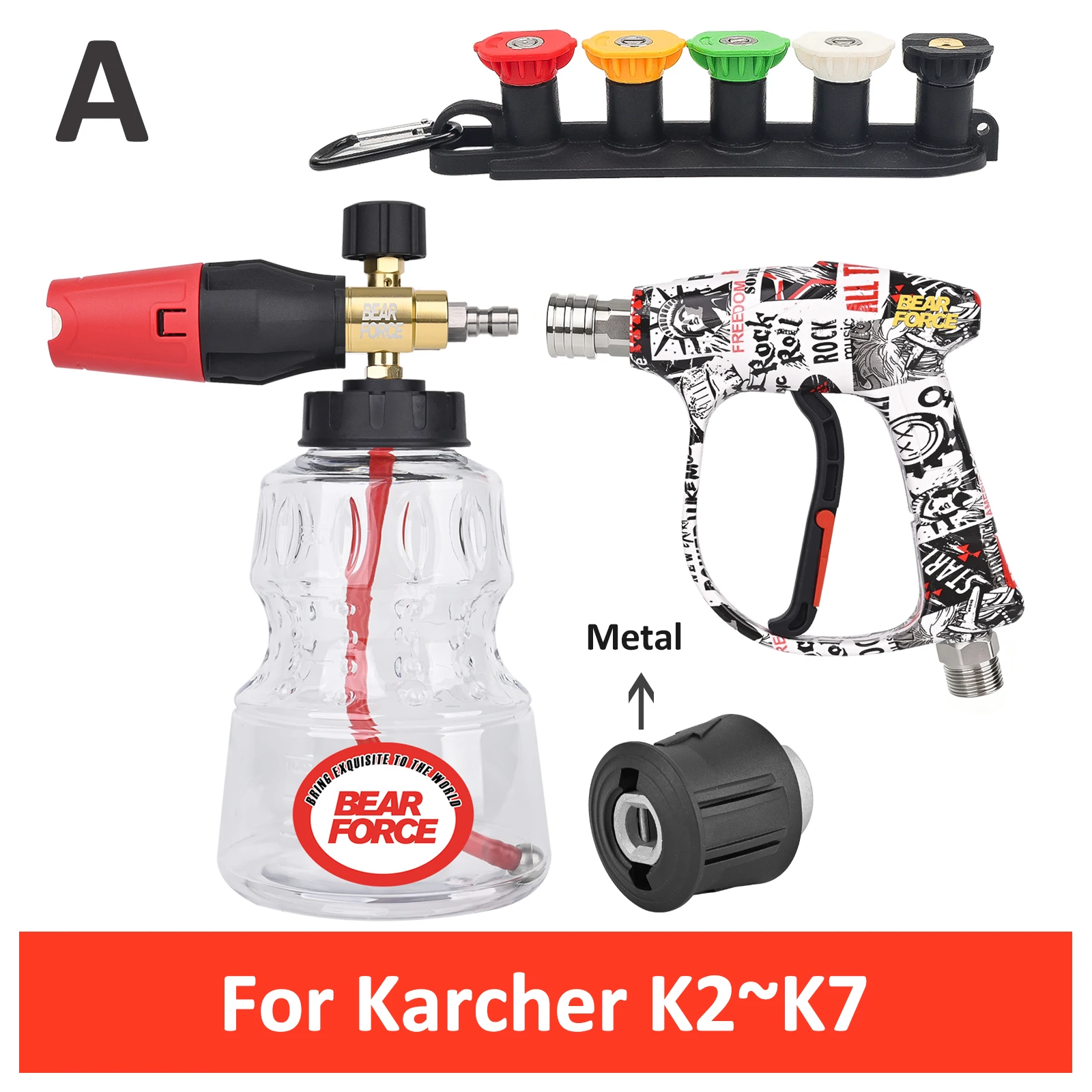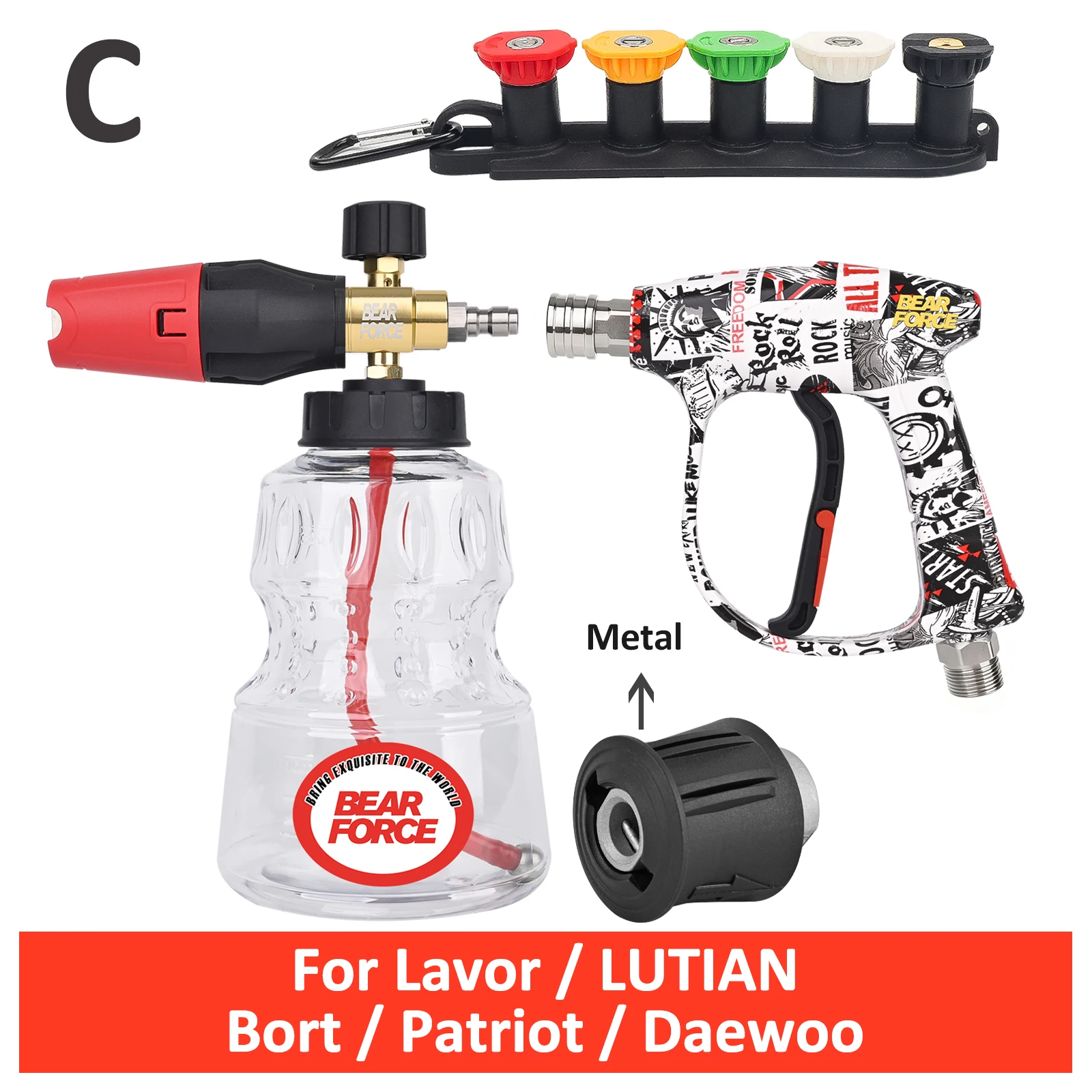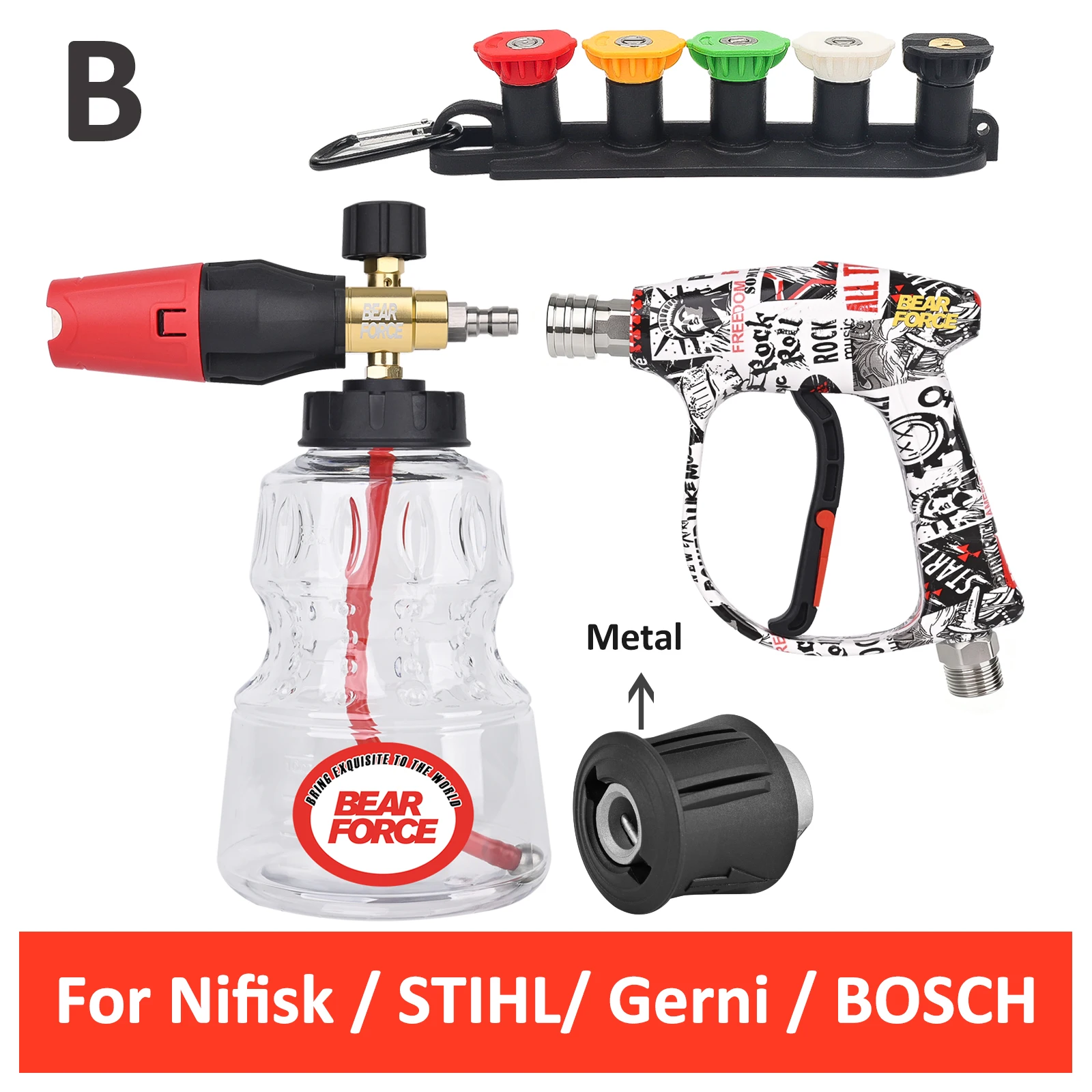 - The set includes a 1/4″ quick connector compatible with multiple pressure washer brands like Karcher, Nilfisk, Bosch, Lavor, Daewoo, and more for seamless attachment and versatility.